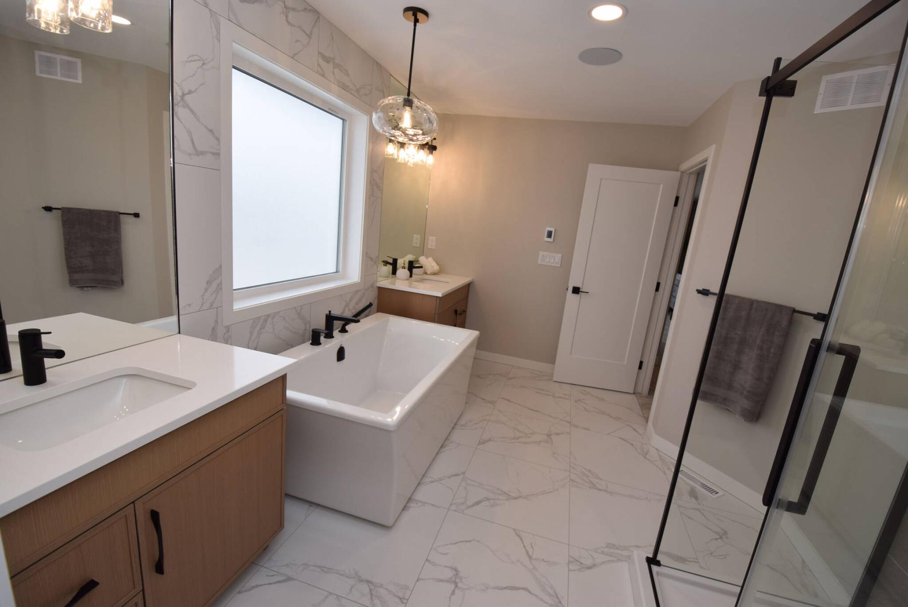 “With its heated tile floor, freestanding soaker tub with matching tile feature wall, custom glass/tile walk-in shower and dual vanities separated by the tub, it’s a gorgeous space that has a spa-like quality to it that relaxes you the moment you step into it,” Van Achte says.