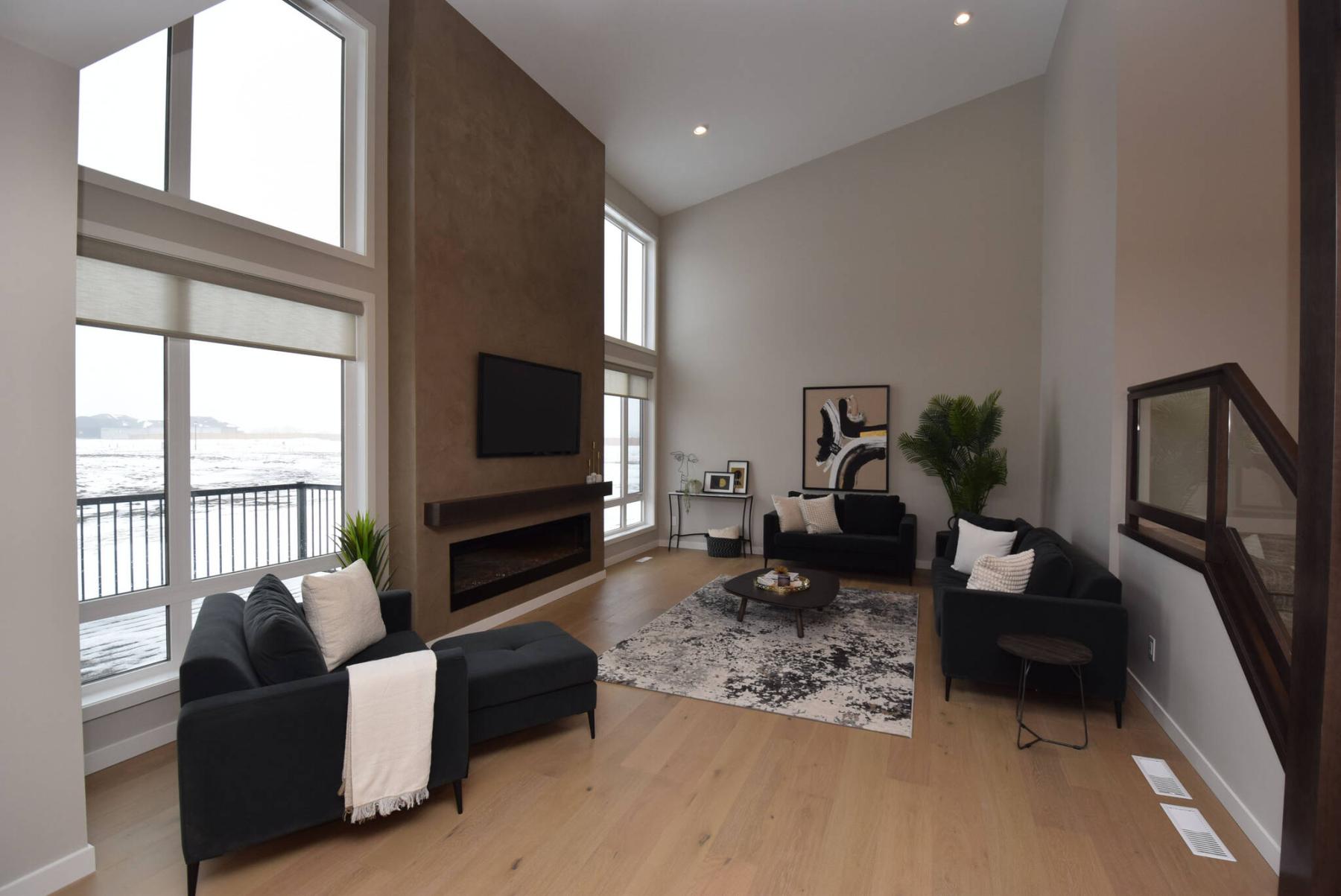 “Essentially, the entertainment unit — which is a floor-to-ceiling taupe plaster feature wall with 72-inch linear electric fireplace and TV niche — is framed perfectly by huge windows on either side that utilize the west exposure to bring in lots of natural light,” he says. “A vaulted ceiling gives it a great feeling of volume.”