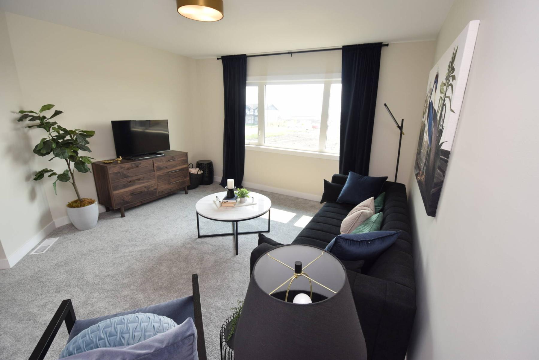 “Lots of natural light comes in from a large picture window on its rear wall, while the neutral colour scheme works really well with the flooring,” she says. “There’s plenty of room for people to sit around and visit, and the linear electric fireplace looks great with its colours, especially at night. It’s just a very comfortable space.”