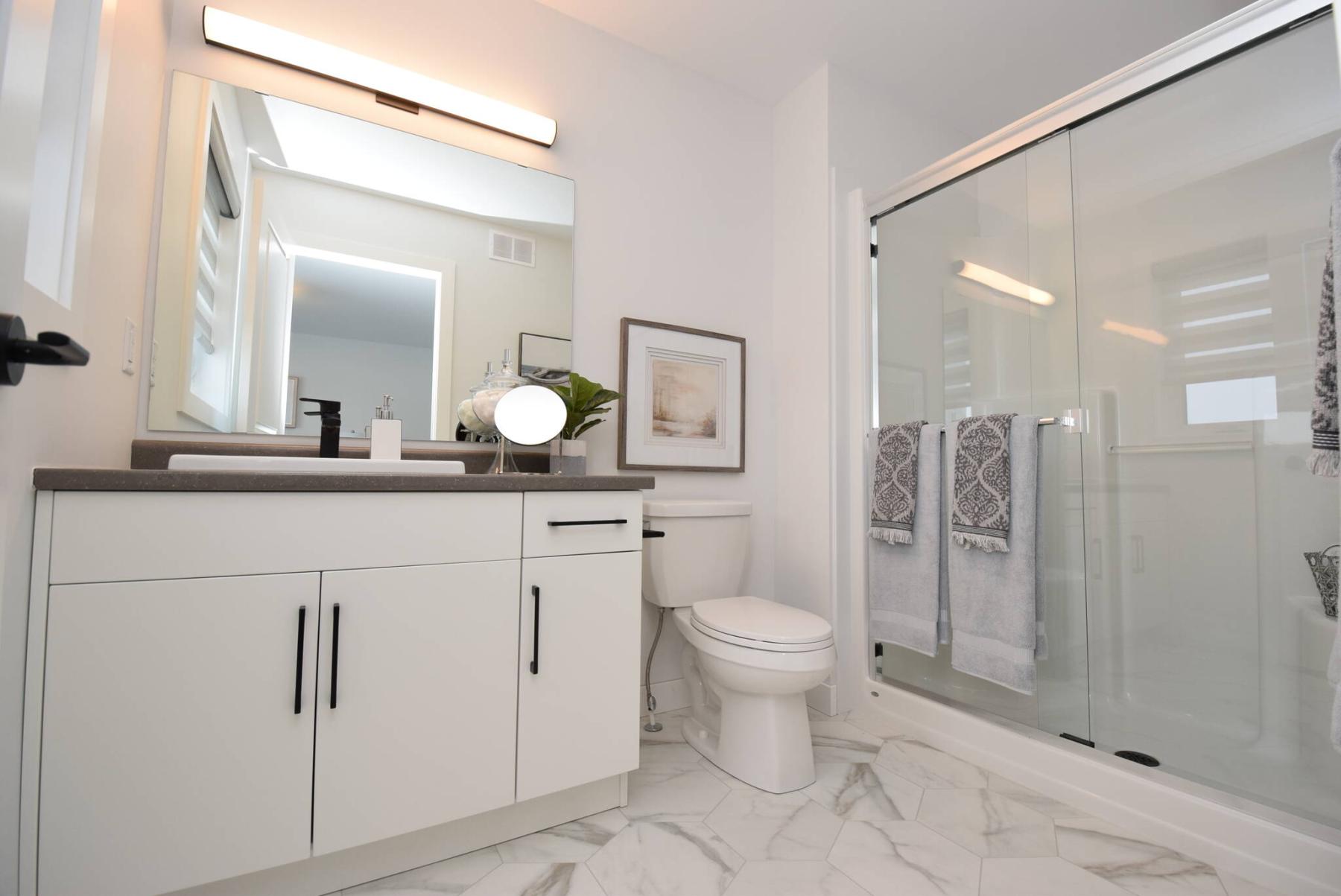 A walk-in shower, marble style vinyl floor and thermofoil vanity give the ensuite a luxurious feel.