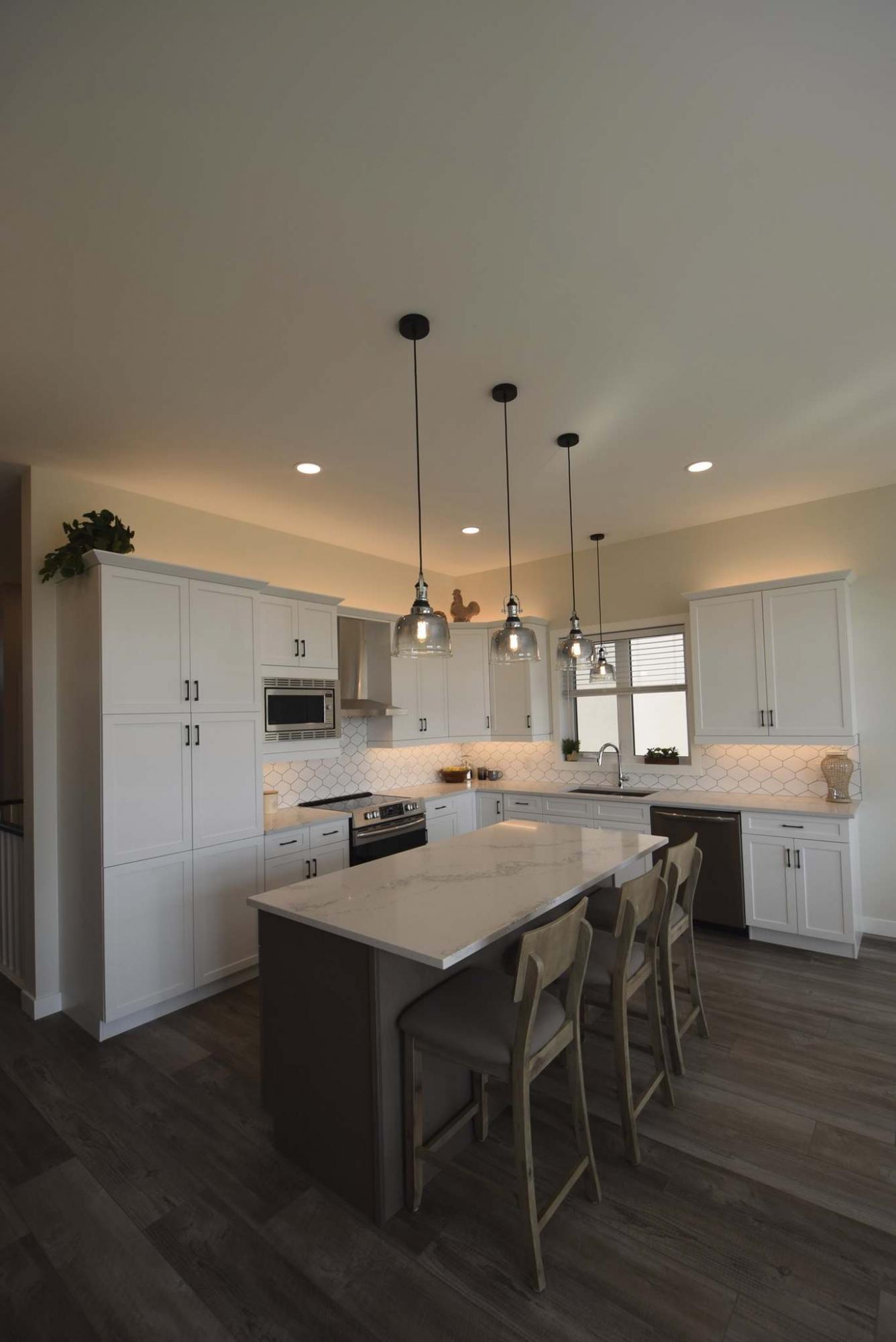"I just love this area — it really exudes a positive vibe, a feel that I think comes from the gorgeous finishes. We started off by putting in a wonderful, distressed brown laminate plank flooring called Salvaged Pine and complemented it with finishes like white shaker cabinets, a white octagonal backsplash, off-white/grey quartz countertops and stainless steel appliances."