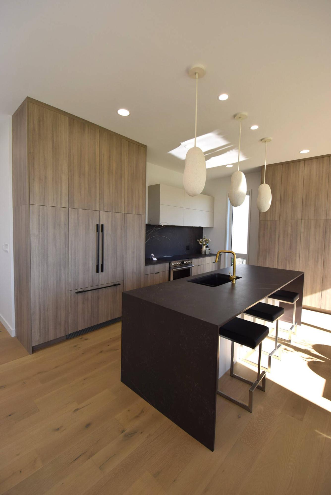 A nine-foot island with matte-black porcelain countertop, waterfall sides and warm woodgrain-style cabinetry serves as the anchor point of the elegantly understated kitchen in