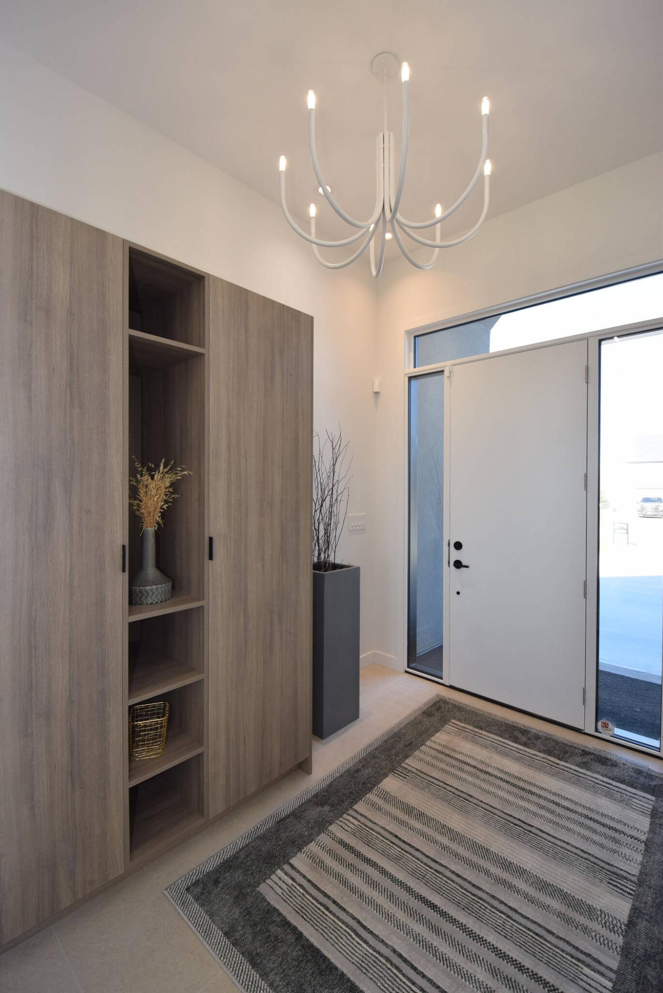 “To change things up, we put in a closet that matches the cabinets in the kitchen,” he says, adding that a display nook with shelving below was installed in the centre of the closet to add style and utility. “There’s room for a bench next to it, while its good width and a 10-foot ceiling create a nice sense of space.”