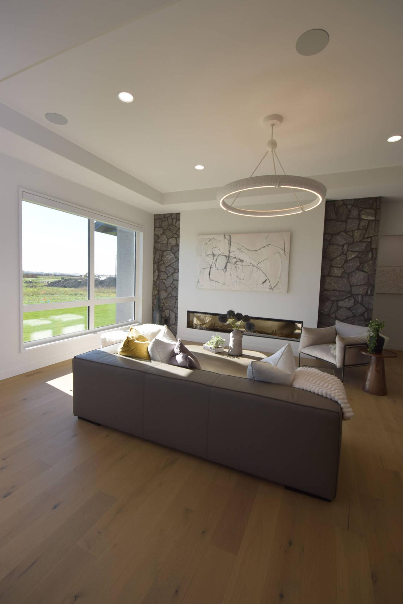 “In the great room, a 100-inch linear electric fireplace set in a simple white drywall feature wall adds a modern touch that’s offset perfectly by stone trim on either side,” says Amero. “A tray ceiling adds style and another foot of ceiling height, while a circular LED light fixture adds another modern touch.”