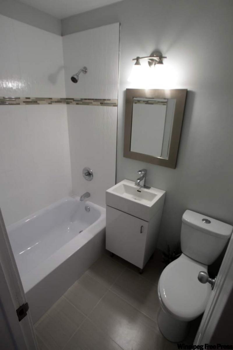 Everything in the kitchen is brand spanking new as well: brown cappuccino thermofoil cabinets with under-mounted lighting, tan laminate countertops, tile backsplash and stainless steel appliances. Meanwhile, the bathrooms have been stylishly retrofitted with beige ceramic tile floors, tile shower surround (with cement wall with waterproof membrane behind) with glass tile accents, glossy white vanity and white one-piece fibreglass tub/shower unit.
