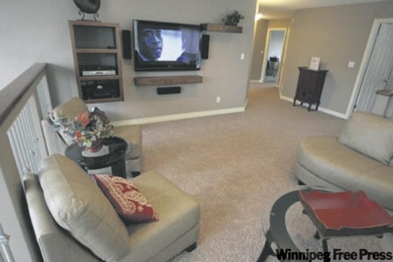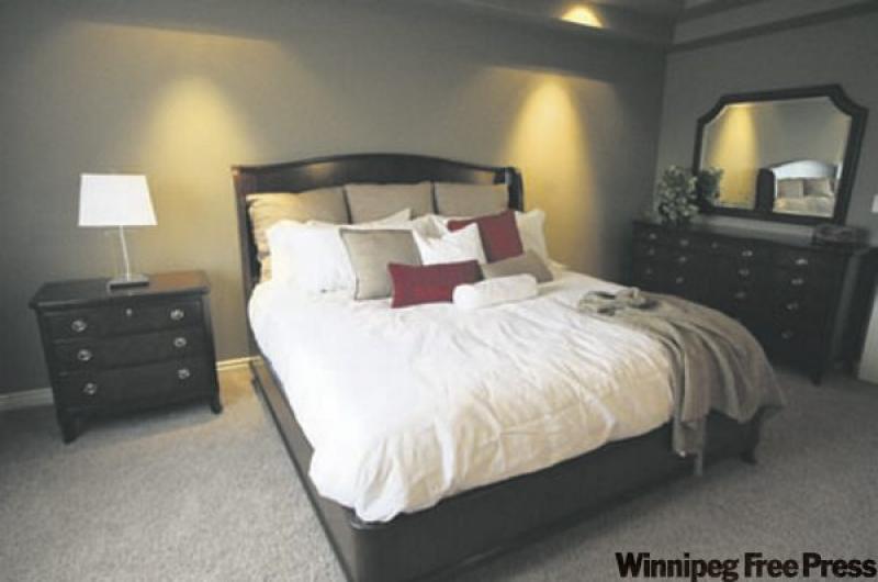 "It's generous-sized, so there's lots of room for a king-sized bed and accessories. We also put in a coffered ceiling to add some style, along with white, four-inch baseboards that offer a bright counterpoint to the chocolate brown walls. The ensuite, with its corner jetted tub, four-foot shower and beige ceramic tile floor (and angled cappuccino maple vanity) is standard, as is the large walk-in closet."
