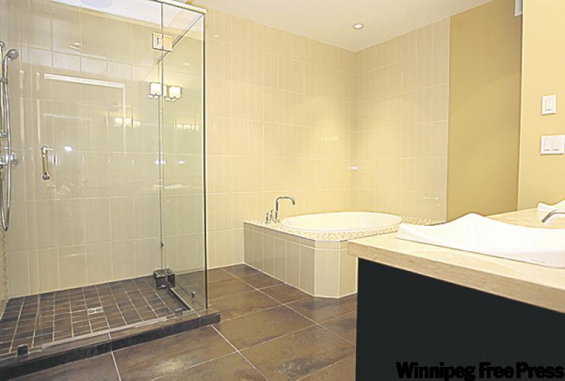 That tile work is especially evident in the bathroom, which features a deep soaker tub and tempered glass shower enclosure, and chocolate brown floor tiling that merges seamlessly with the vertically-cut tan tile on the wall.