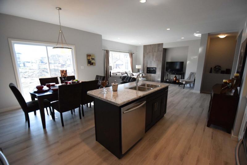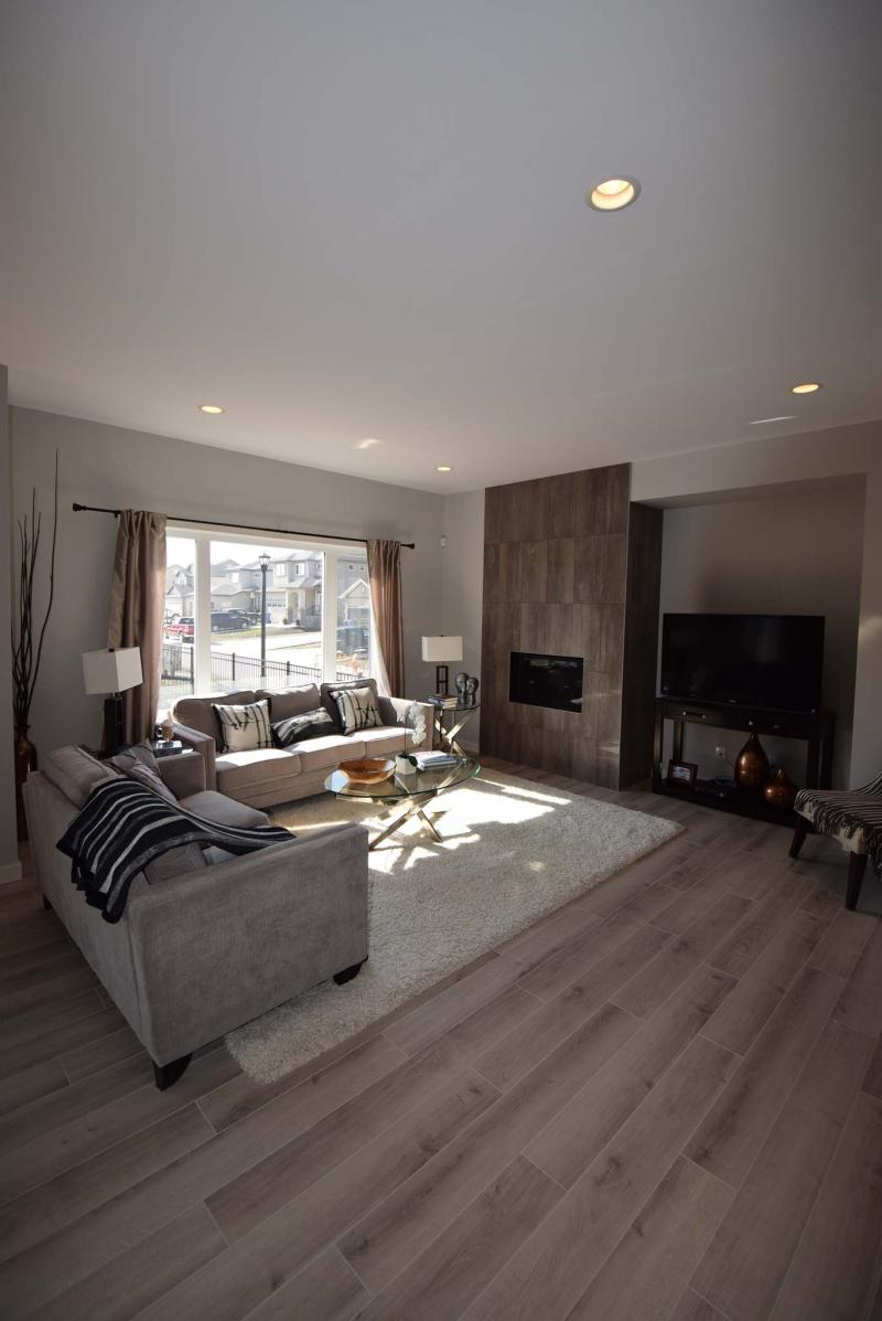 While Ventura didn’t go overboard in decking out the Stradford with all kinds of flashy, optional finishes, it does contain a few upgrades: a taupe glass-tile backsplash in the kitchen, fireplace/entertainment centre in the family room and wide plank-laminate flooring that runs through the great room and foyer.