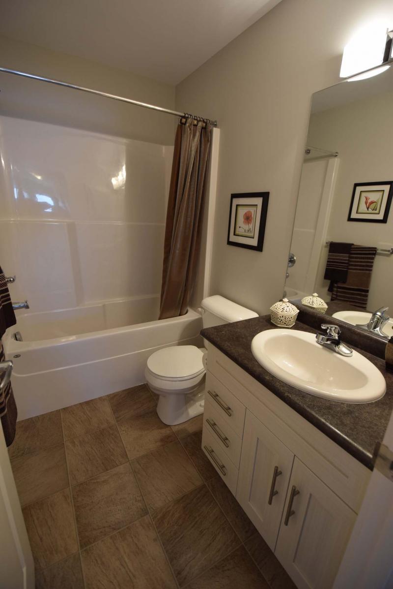 The ensuite features a five-foot shower, portobello thermofoil vanity with dark brown laminate countertop and smart faux tile (vinyl) floor.