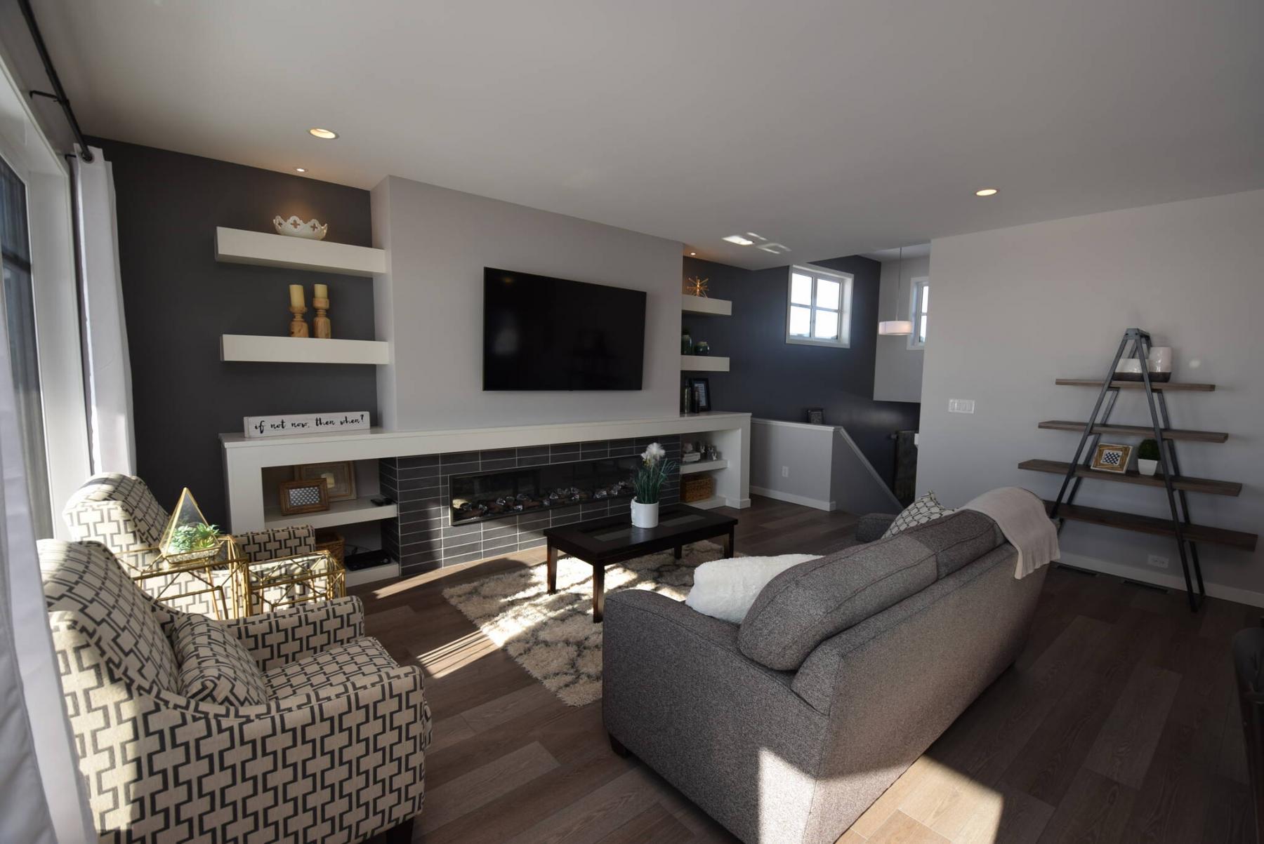 Its optional entertainment unit looks amazing. Theres a linear electric fireplace set in grey tile below a white feature wall with oversized TV space above, along with a white mantel and white shelving. A grey feature wall behind it really allows it to stand out.
