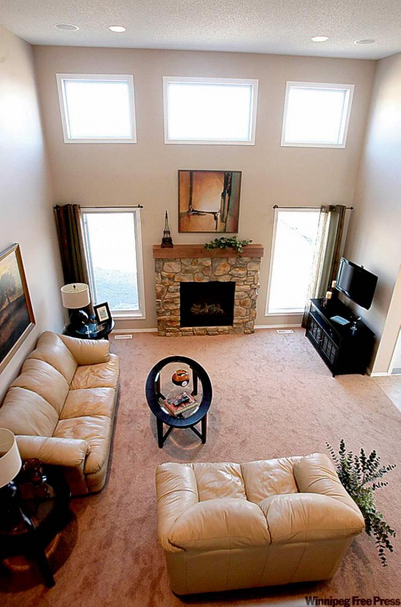 And there's more: an expansive family room highlighted a cultured stone fireplace (with large windows one either side), 14-foot ceiling and smart taupe carpet to define its parameters.