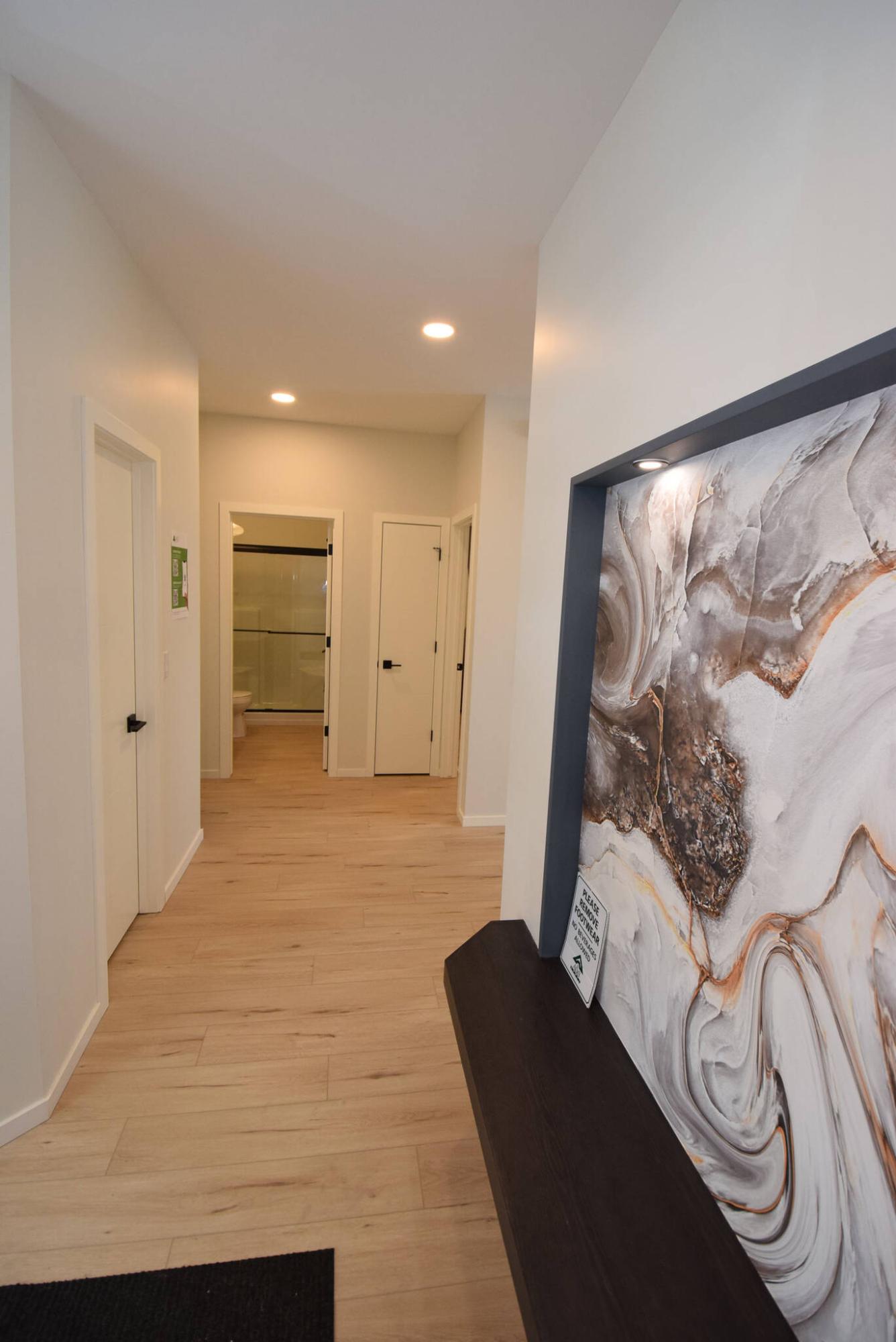 The home’s foyer transitions into a hallway leading to a bedroom and three-piece bath.
