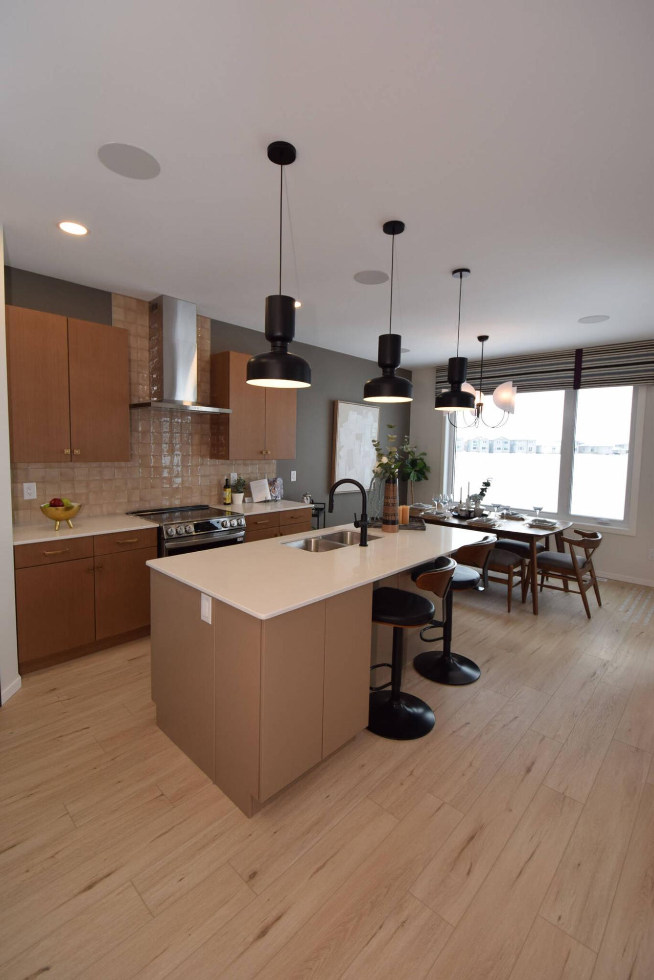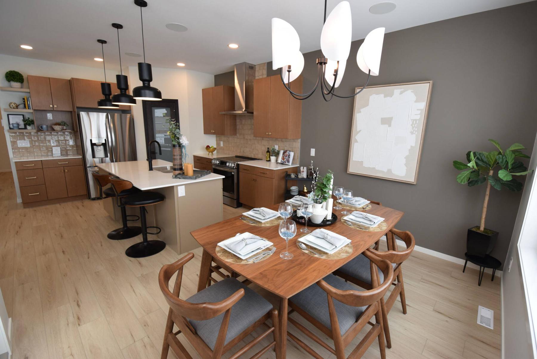 The kitchen/dining area in A & S Homes’ Camden model dwelling in Prairie Pointe is a stylish, versatile space filled with natural light.