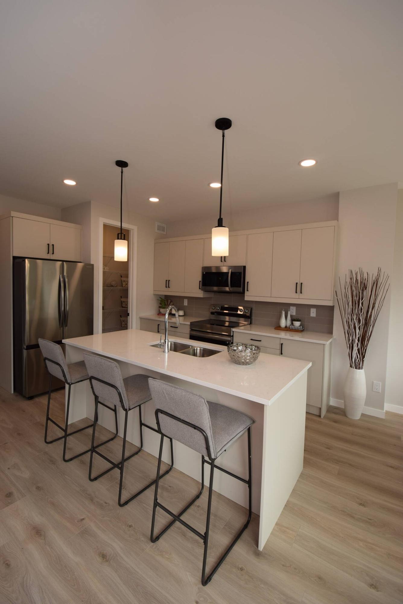 The island kitchen in this roomy Sage Creek townhome is stylish and functional.
