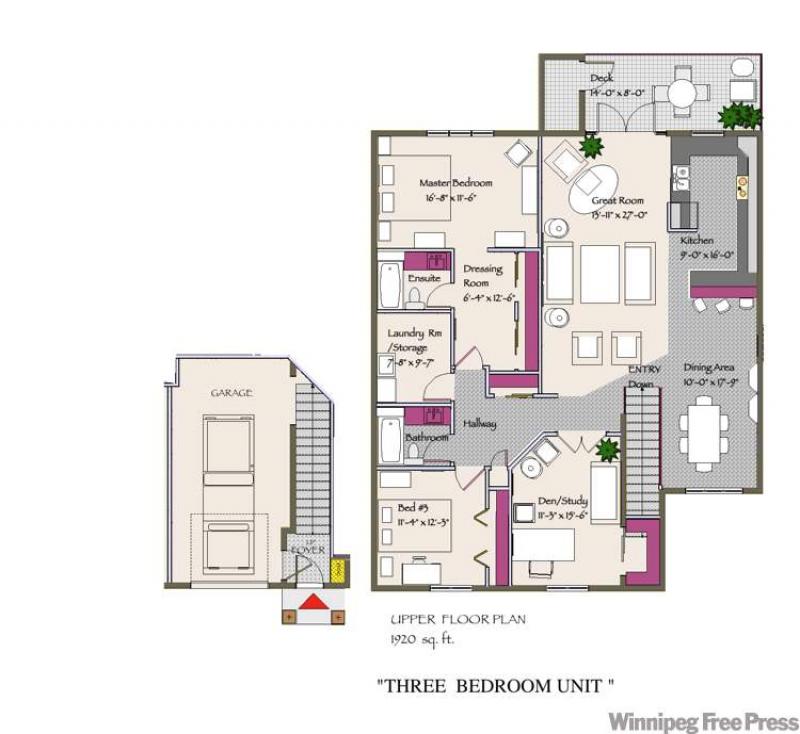 "Both the master suite (nearly 17 feet by 12 feet) and great room (almost 14 feet by 27 feet) will offer all kinds of space," De Leeuw said, adding residents will be able to drive into the garage at ground level and take a set of stairs up directly into the unit. "There'll also be a balcony situated so it's very private. You won't be able to see into the patio and courtyard below, so everyone's privacy is assured. You get two balconies. One will be facing east, the other west."