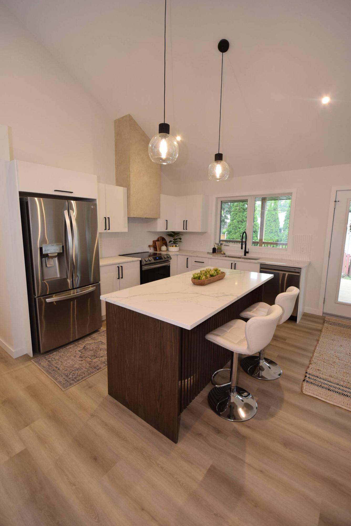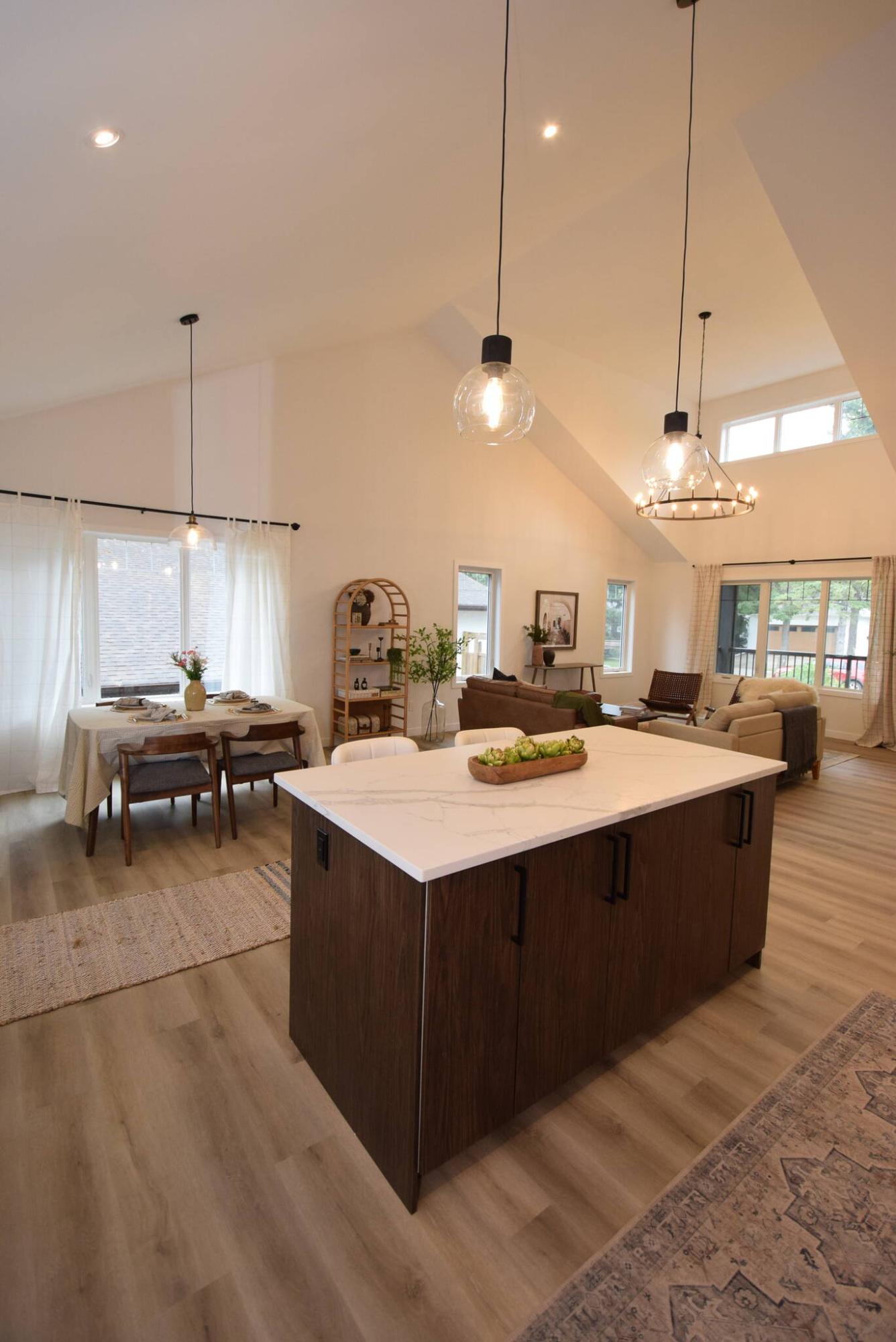 “It’s 15 feet, six inches high at its highest point,” he notes. “But it’s most spectacular over the great room, where the ceiling is carved out. A large window high up allows lots of natural light to come in, while a circular, candelabra-style chandelier adds a fantastic touch of luxury. Warm luxury vinyl plank flooring adds to the inviting feel with its warmth.”