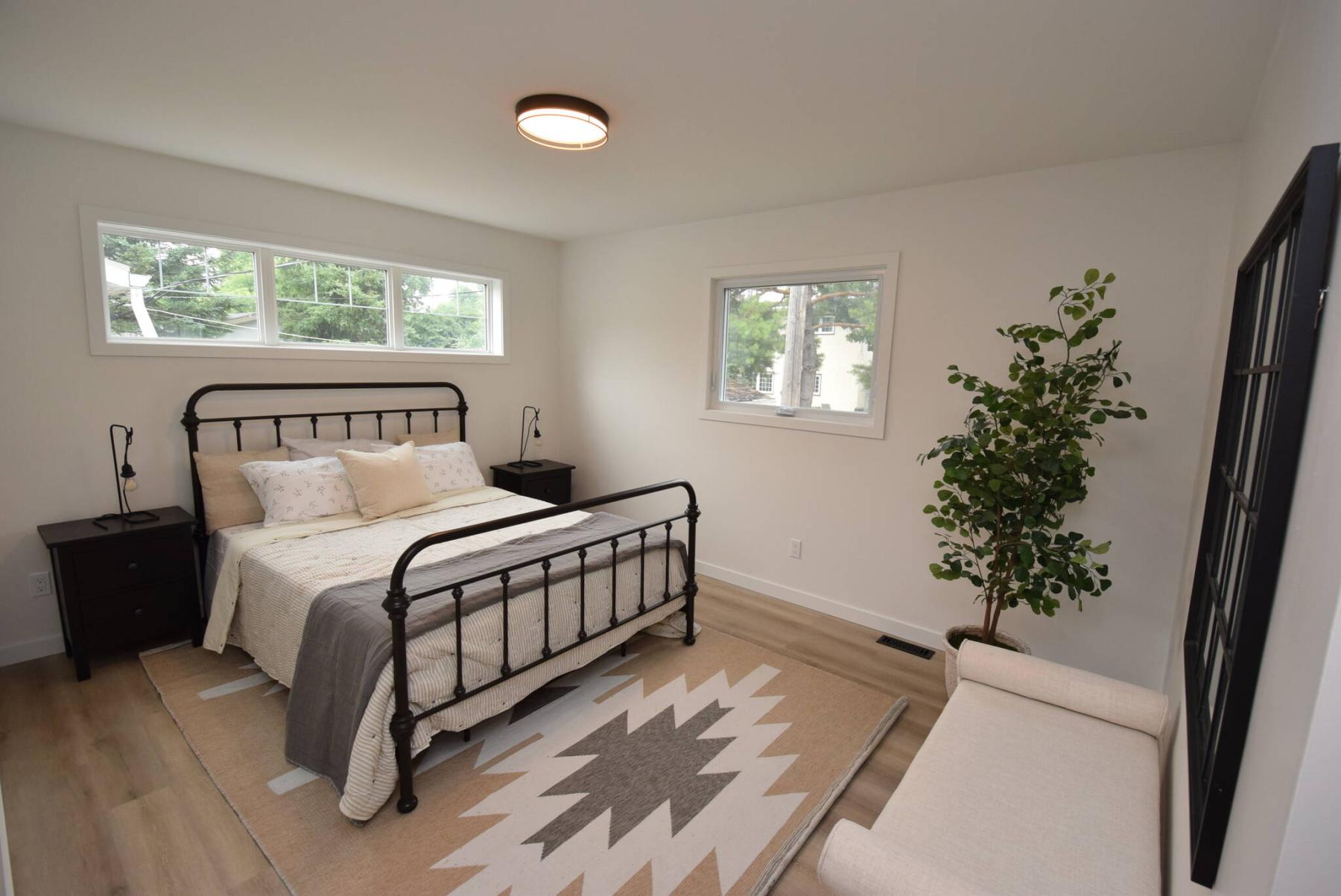 “An oversized transom window above the bed and large window on the rear wall let in tons of light and also provide views of all the mature trees that surround the home,” says Zappia. “A doorway on its side wall features a big walk-in closet to the left, a makeup or dressing area in the centre and a gorgeous four-piece ensuite with tiled tub/shower combination to the right.”