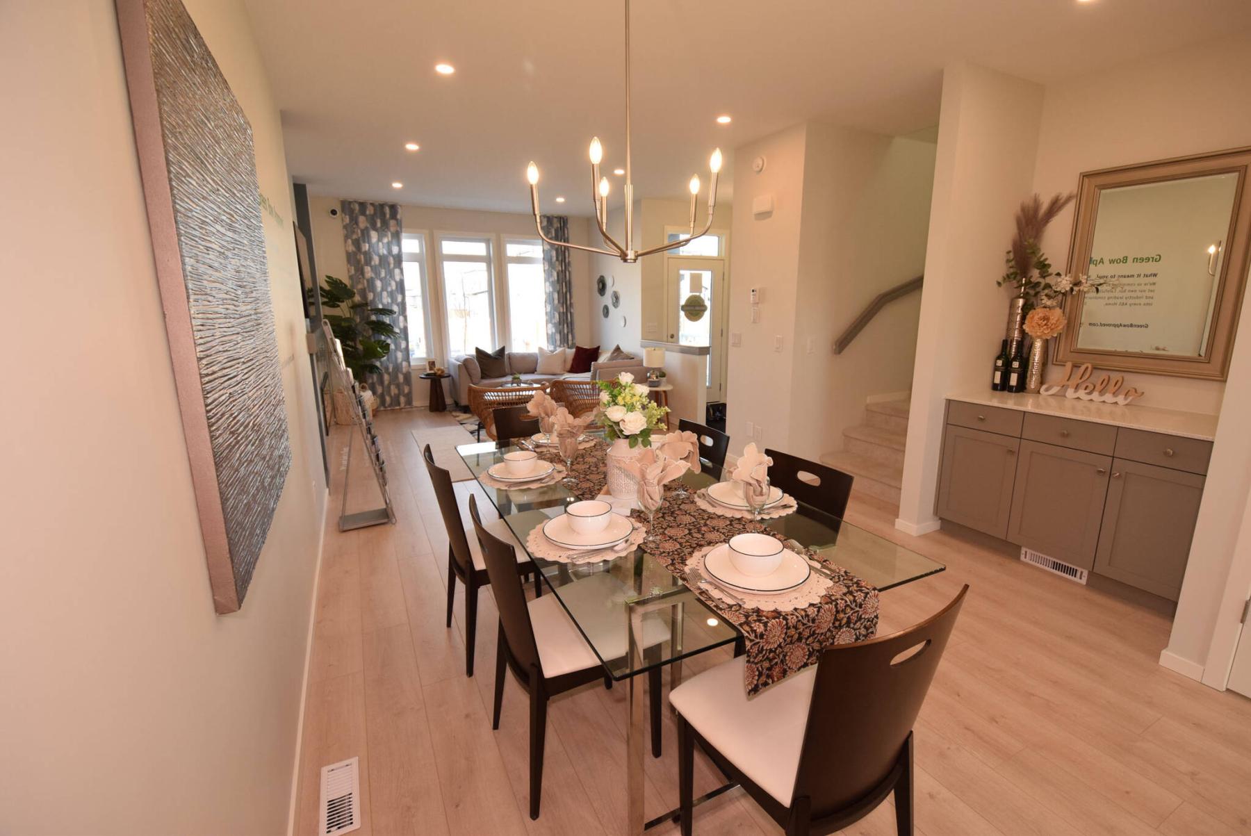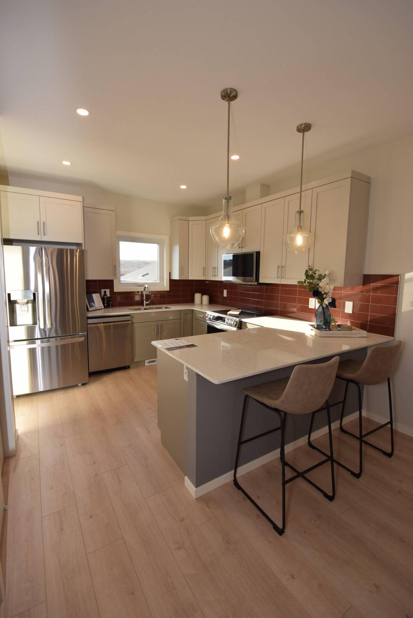 The roomy peninsula-style kitchen in A & S Homes’ two-storey Belmont design in Prairie Pointe offers a welcome blend of flair and functionality.