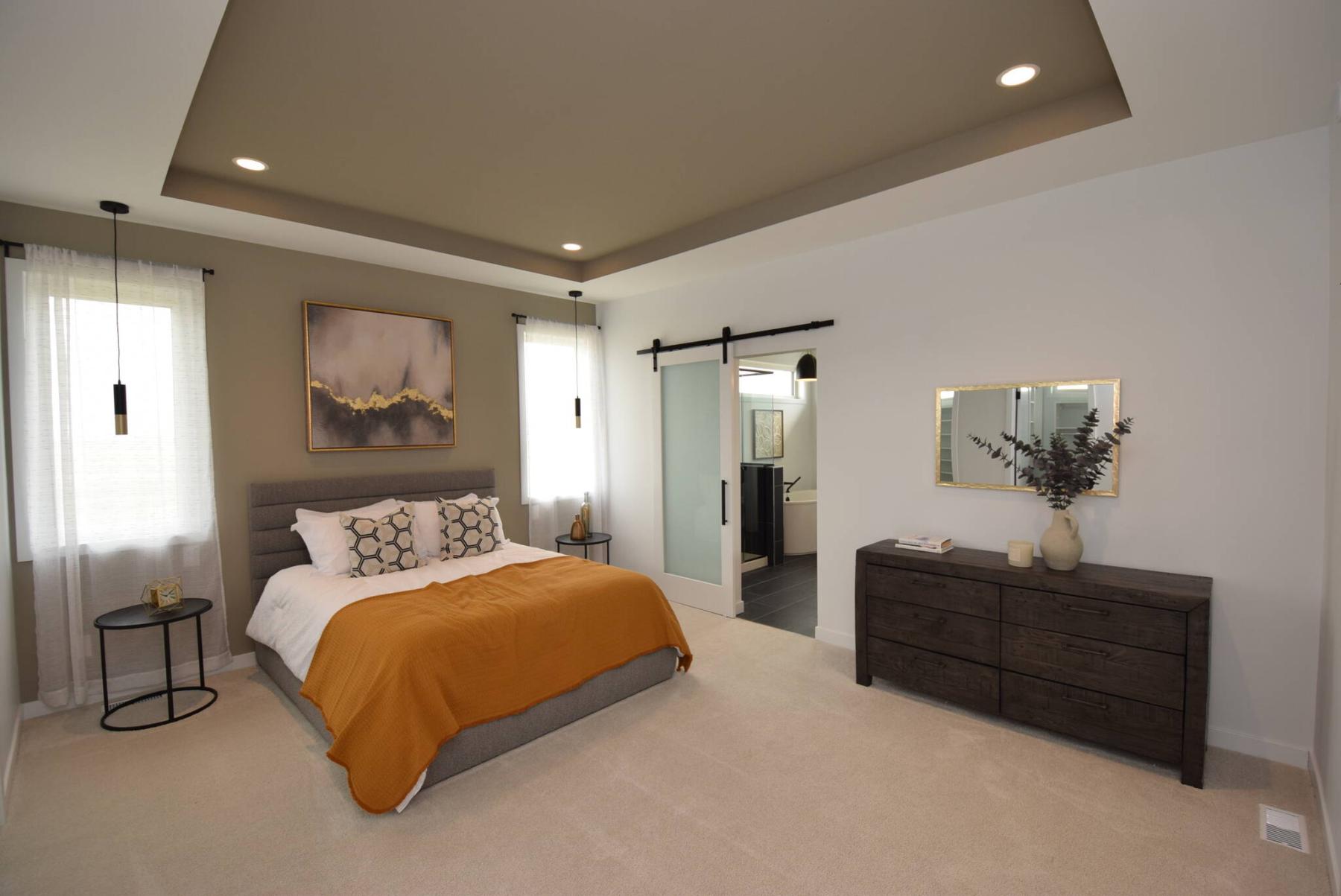 Cool design touches and a slick barn-style door on the ensuite give the primary bedroom a great sense of style.