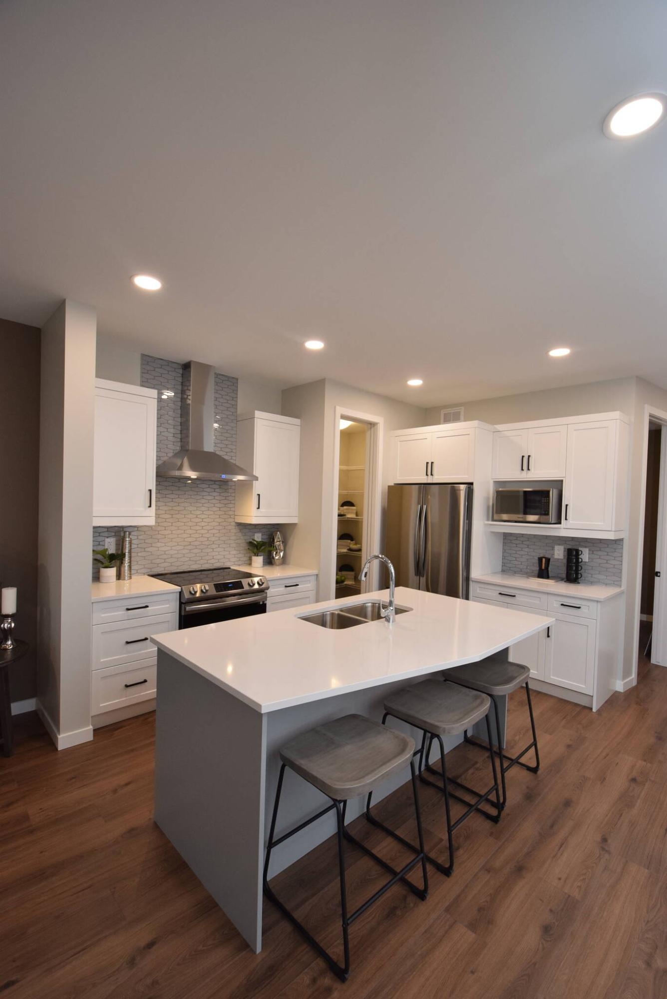 “I just love the size of the island — it’s big enough to work well for morning breakfasts with the kids or entertaining, yet isn’t so big that it takes up too much space. The kitchen is just gorgeous with seamless quartz countertops, white soft-close cabinets, a beautiful tile backsplash — and walk-in pantry with an impressive eight-foot door that has a pocket door to close it off with.”