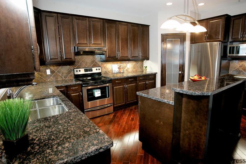 Thanks to another huge window in the living room and a low-slung, boxed out window with 12-inch-deep sill and nine-foot ceilings, the great room is awash in natural light. To offset the brightness, Hilton's designers went with cappuccino maple cabinets (framed by a smashing diamond-shaped bronze porcelain tile backsplash), black/bronze granite countertops and dark-stained walnut floors.