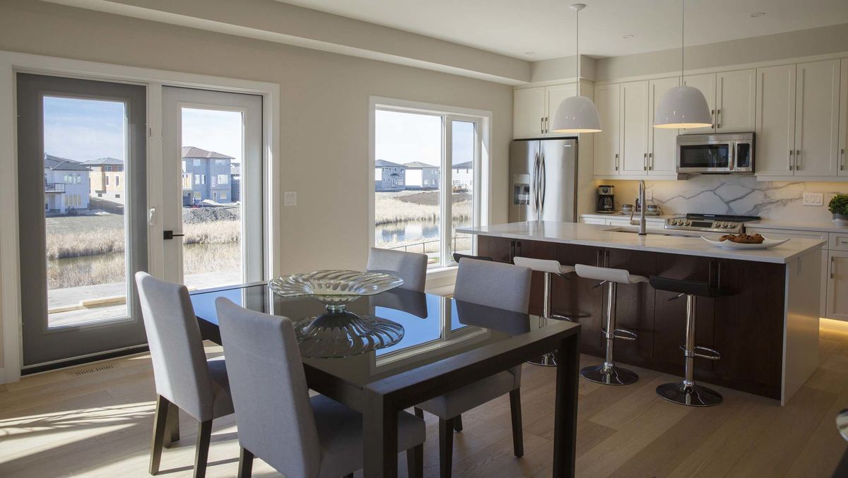 The kitchen-dining area in Sytko Homes’ the Beacon at 10 Canvasback Cove in South Pointe offers sweeping views of the water.