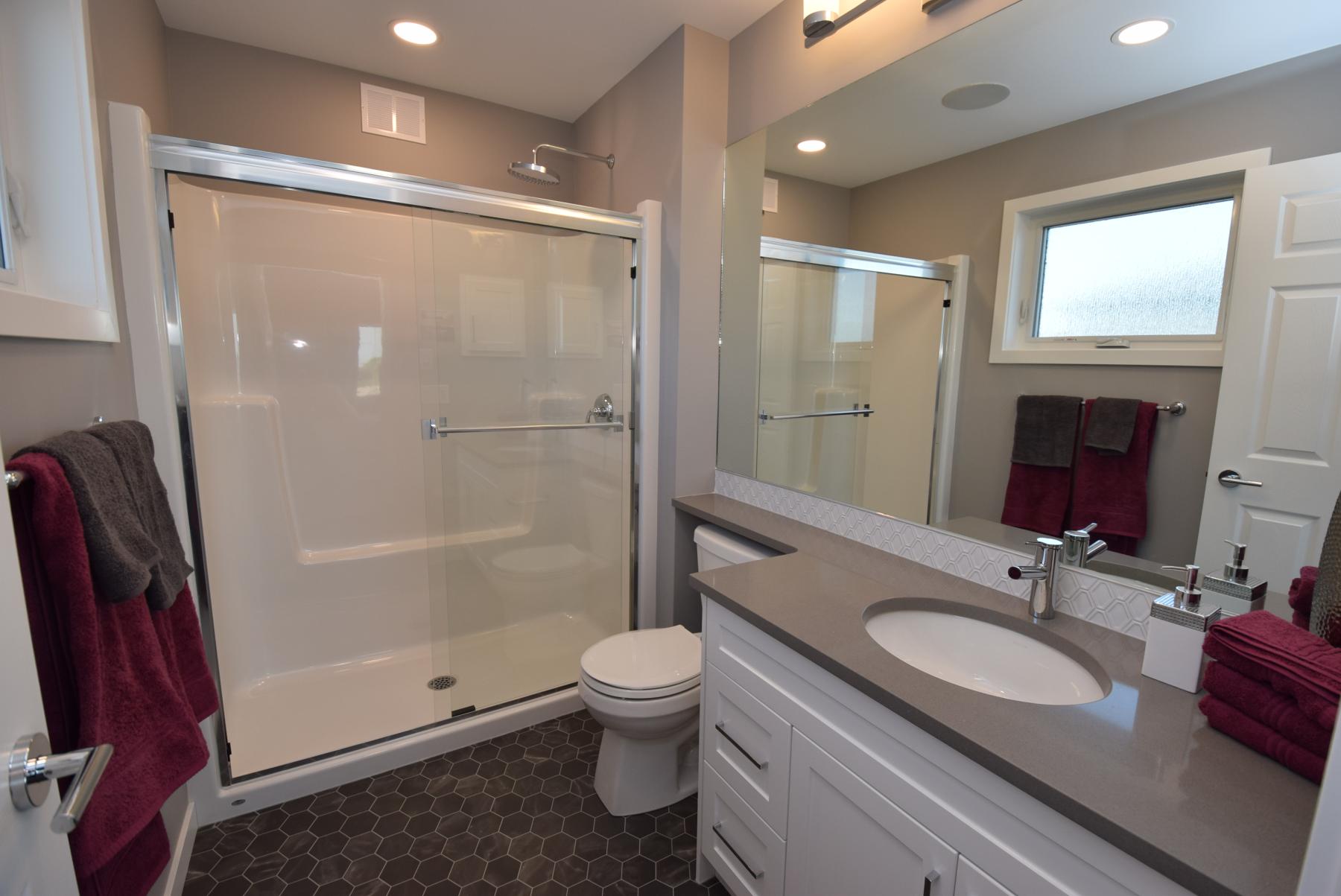 “It has everything that you need, lots of space and light in the bedroom, a large walk-in closet and a deluxe ensuite with a walk-in shower, white vanity with quartz countertop and grey vinyl floor with a hexagonal pattern,” says Thind.