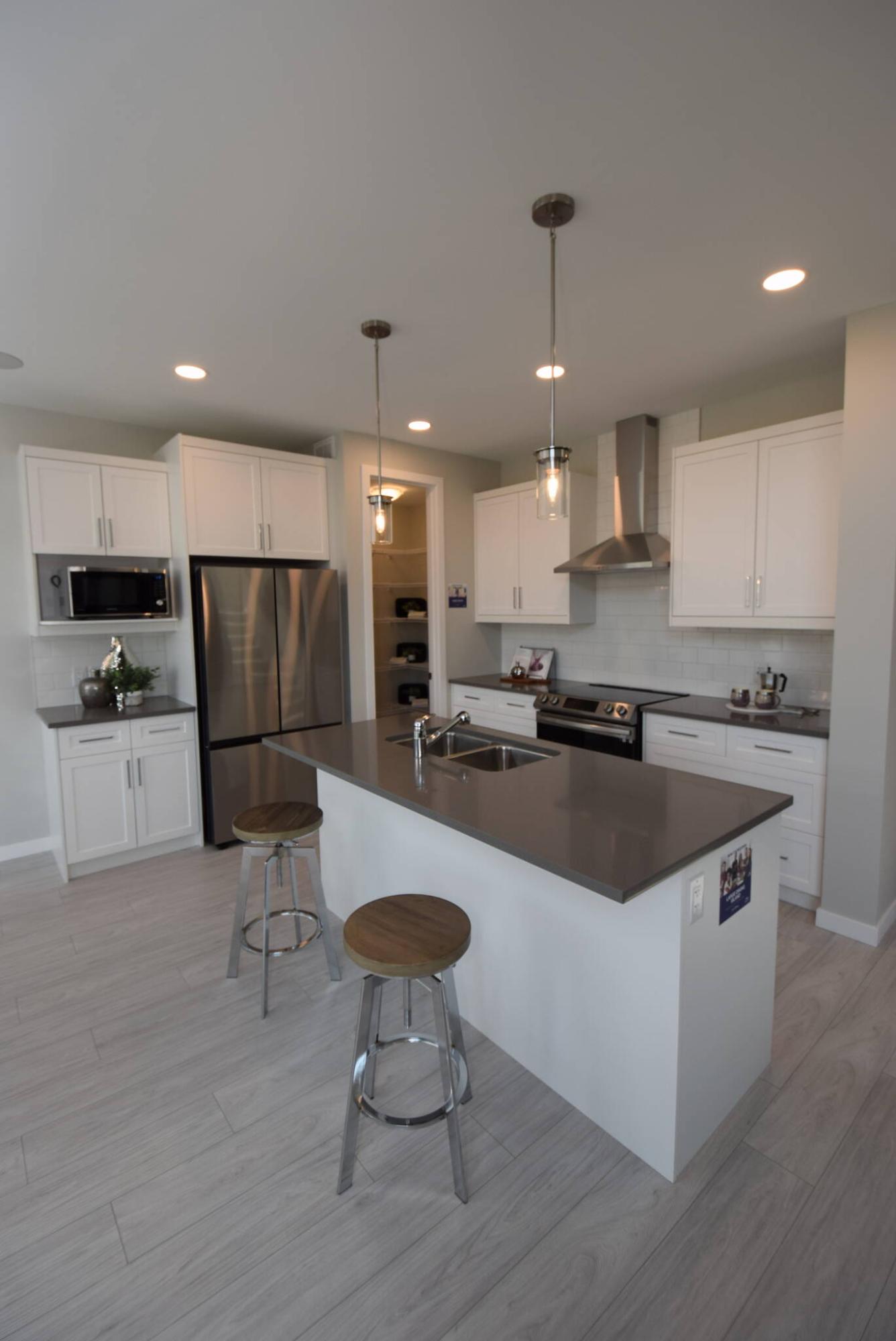 The colour palette is as close to perfection as you’ll find, a textured taupe laminate plank floor blending seamlessly with elegant white cabinets, grey countertops, and stainless appliances in the kitchen.
