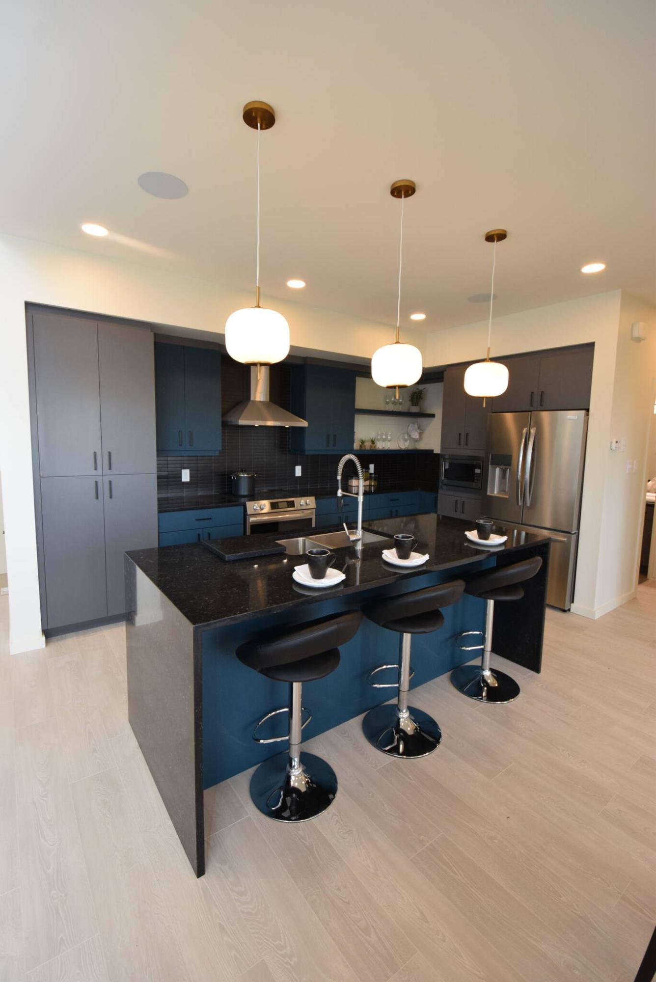 “Everyone loved the colour scheme,” notes Ftoma. “Instead of going with the usual white/grey cabinetry, Gino’s design team used teal to add a nice pop of colour on the island’s base, and the upper and lower cabinets around the range. They go perfectly with the grey cabinets, too. People also really liked the island with its black quartz countertop and waterfall sides.”