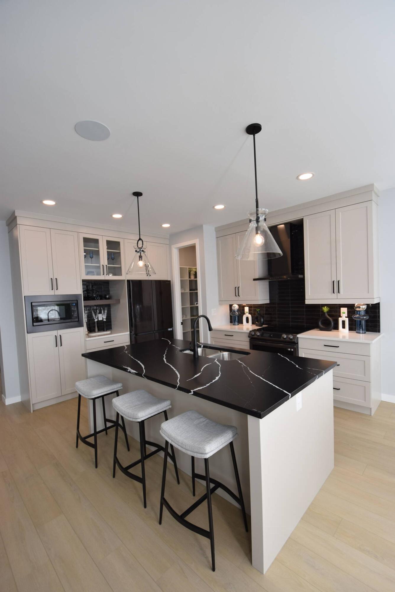 “The kitchen is anchored by an eight-foot island with matte black quartz countertop with white highlights that contrasts wonderfully with light taupe cabinetry,” he says. “A black tile backsplash adds depth, while gunmetal appliances look amazing. The area is then finished off perfectly by a pantry with an eight-foot door.”