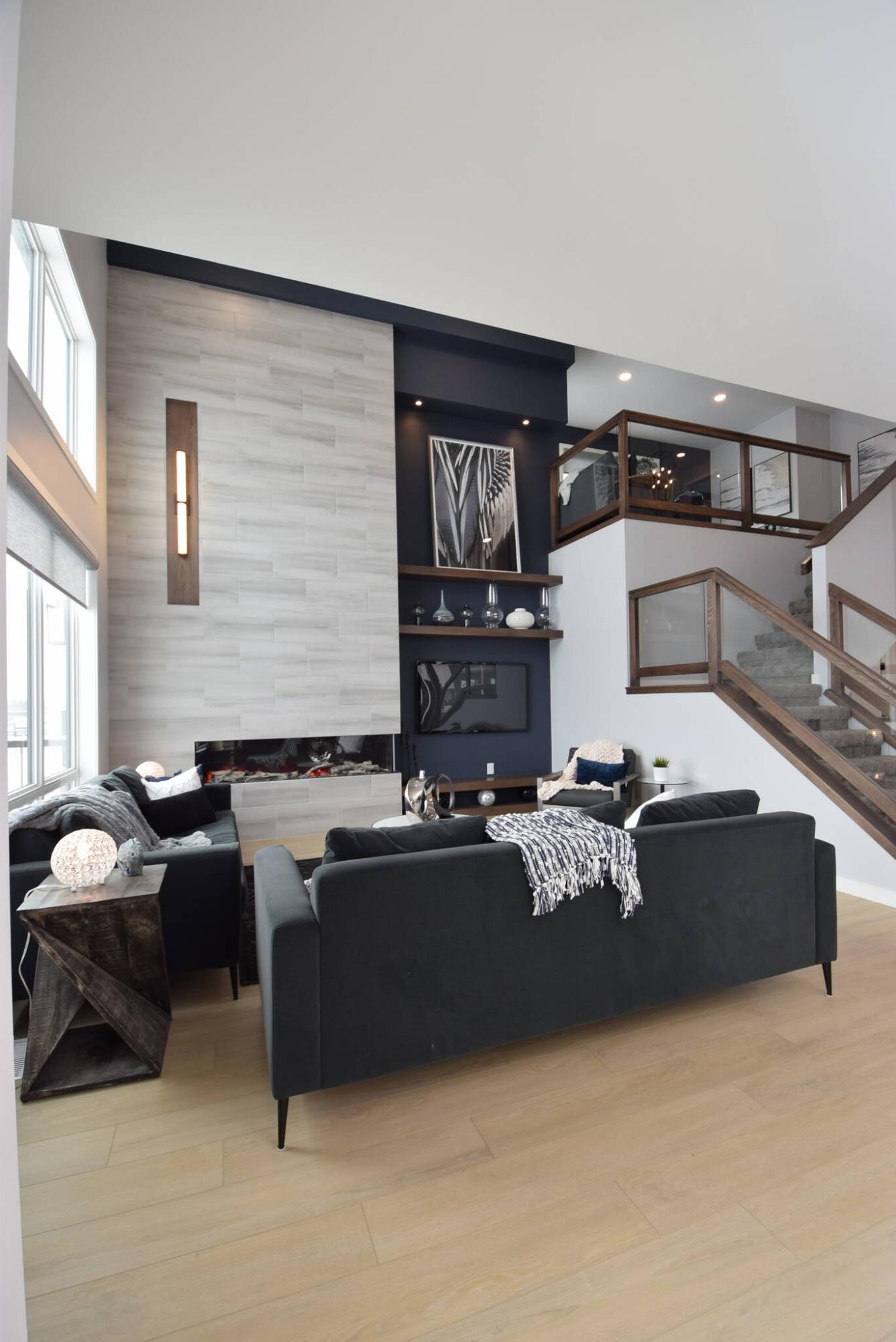 “Everyone who’s been through the home has loved its flow, space and all the natural light,” Moran says. “Flow from space to space is effortless. In particular, the great room, with its soaring ceiling, huge windows, and custom entertainment unit with tiled feature wall with linear electric fireplace, and huge TV niche with display area above is just gorgeous.”