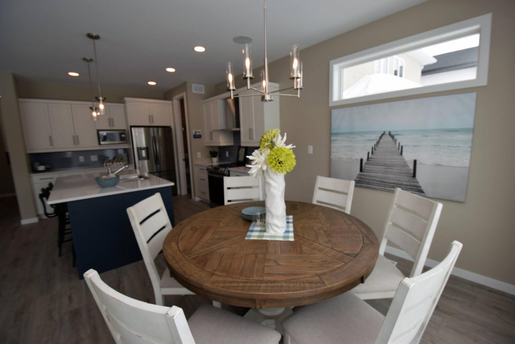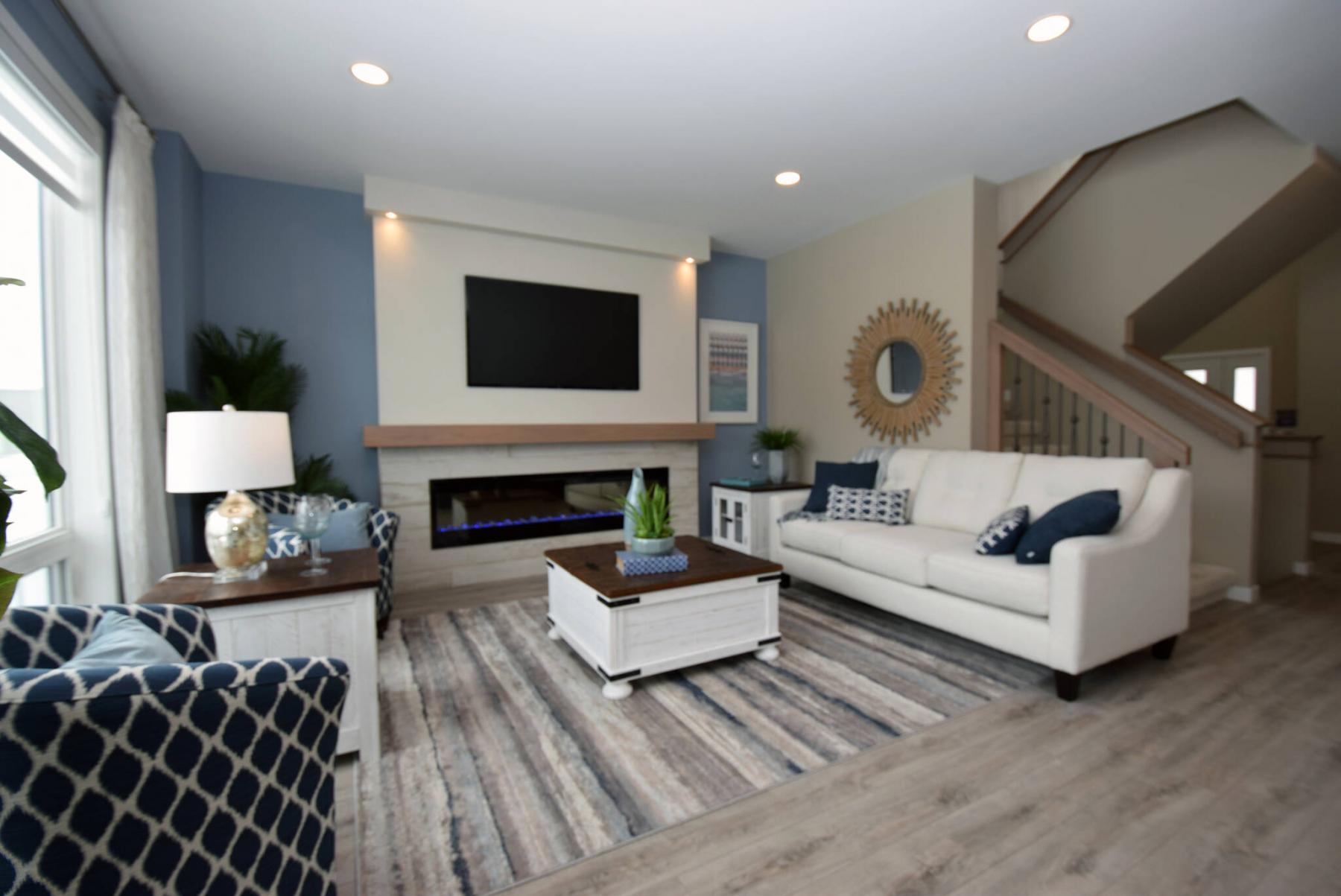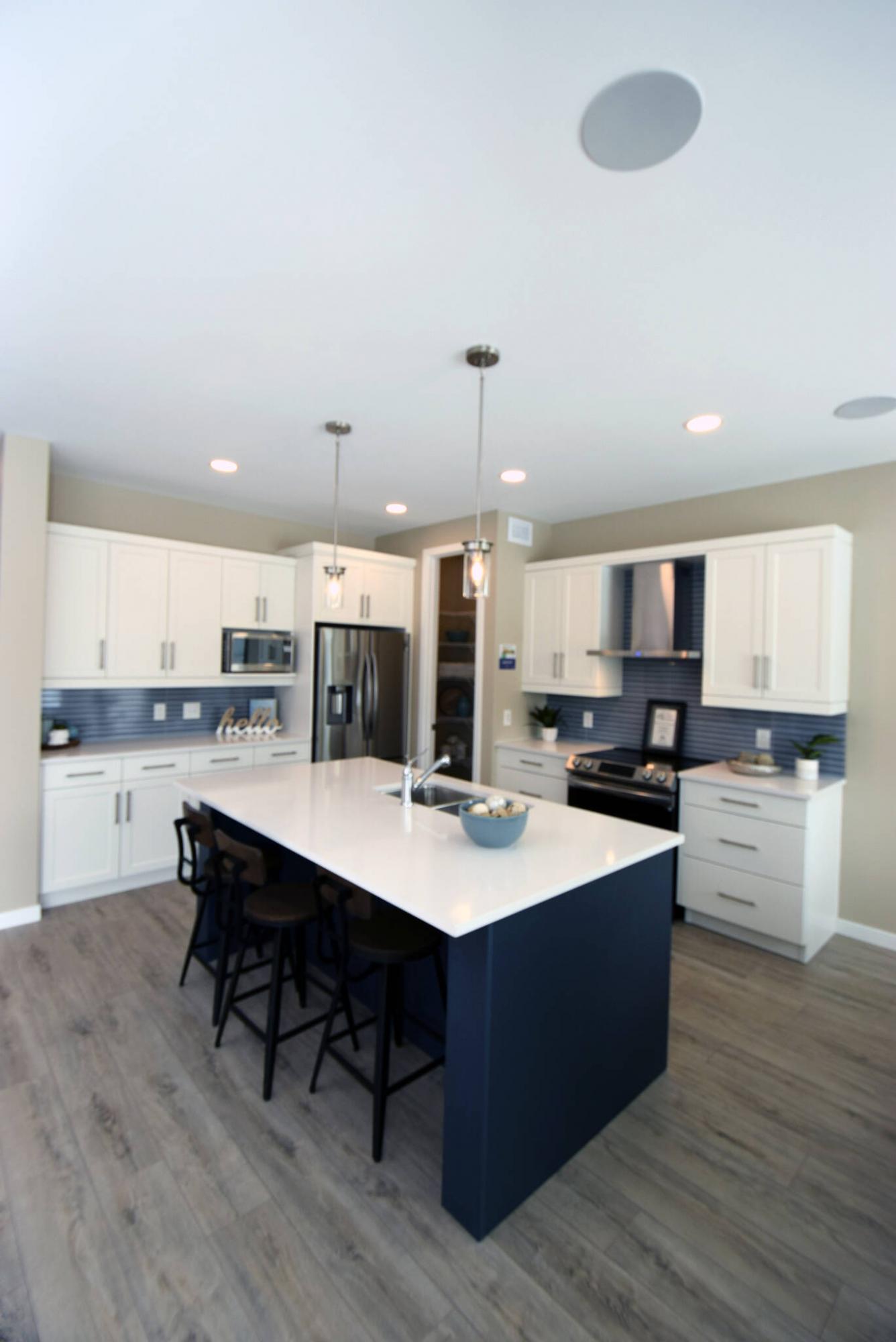 Off-white quartz countertops, a steel blue island, extra-long, off-white raised cabinets and a staggered grey/blue tile backsplash give the island kitchen lots of wow factor, he says. And the optional entertainment unit in the great room, with its linear fireplace with barnwood-style surround and blue/grey feature wall, looks great.