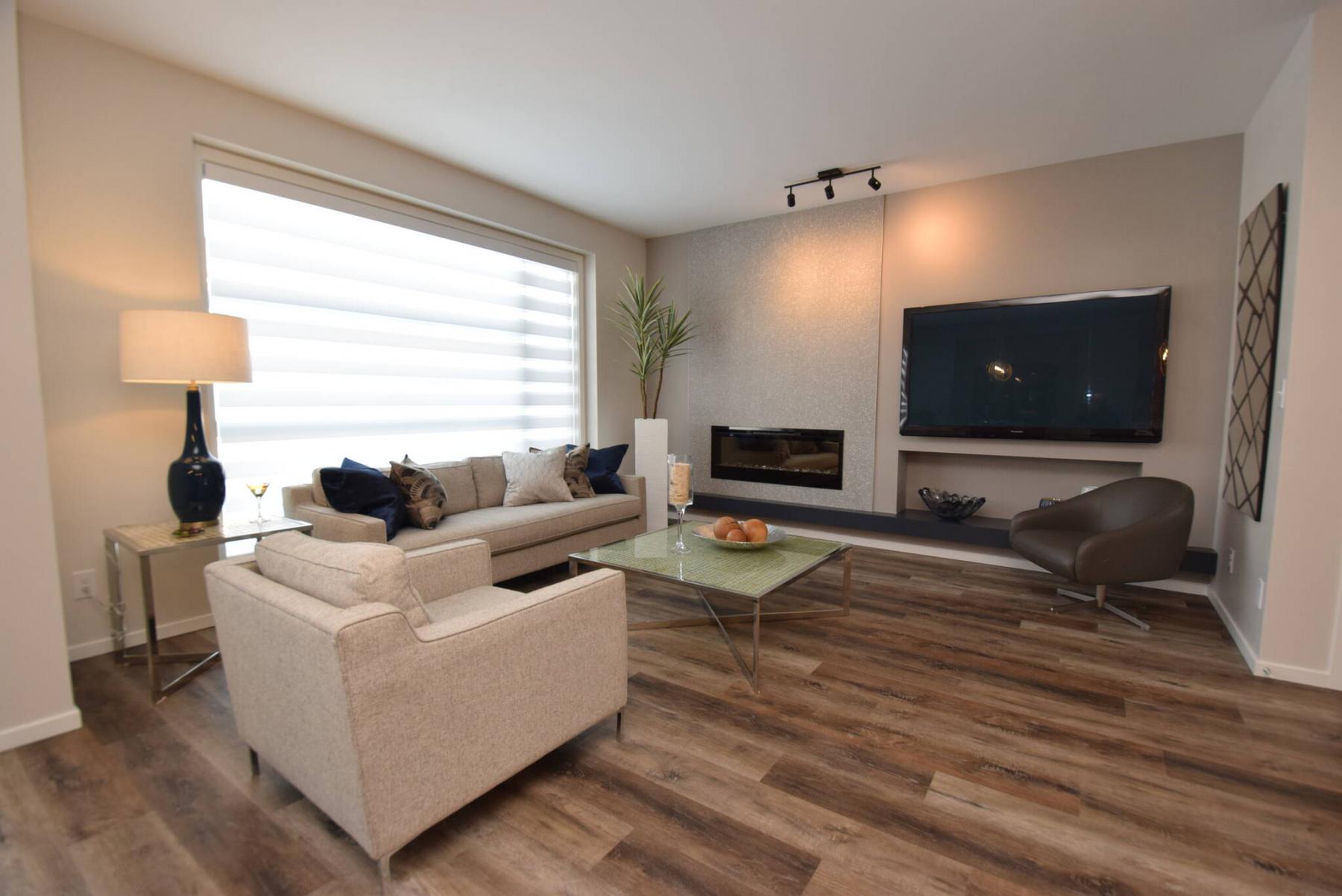 We went with a grey, terrazzo-style tile feature wall around the linear electric fireplace that provides a modern look, yet has warm, organic elements to it, notes Curtis. Theres also a huge TV area to the right of the fireplace that can hold up to a 70-inch TV.