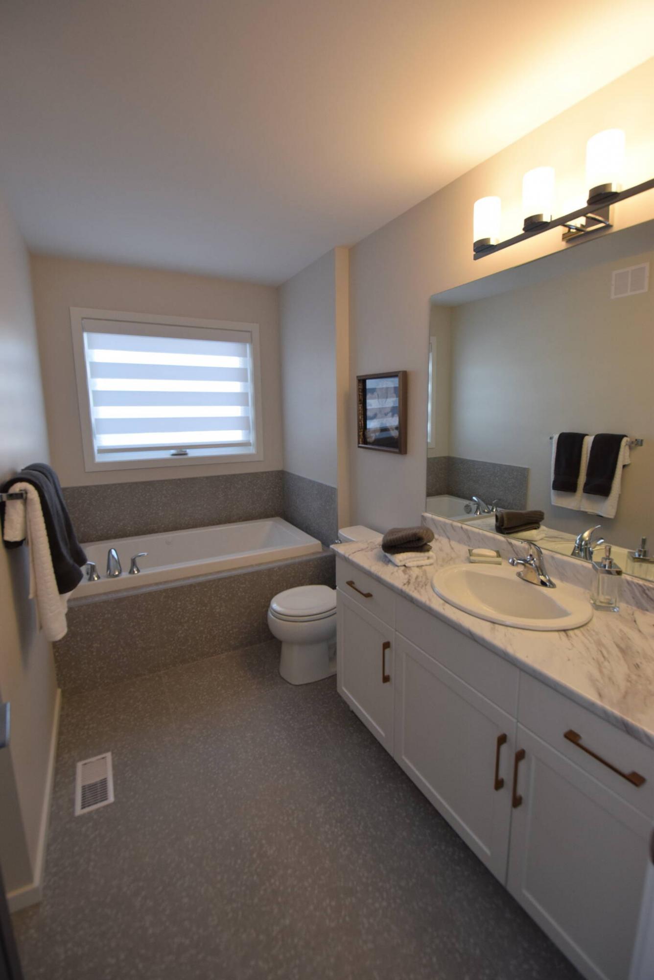 As spacious as it is, it feels even bigger due to a vaulted ceiling overhead, says Curtis. A big walk-in closet provides lots of storage space and a spa-like ensuite with terrazzo-style tile floor and jetted tub with the identical tile surround is a great spot to soak away your stress.