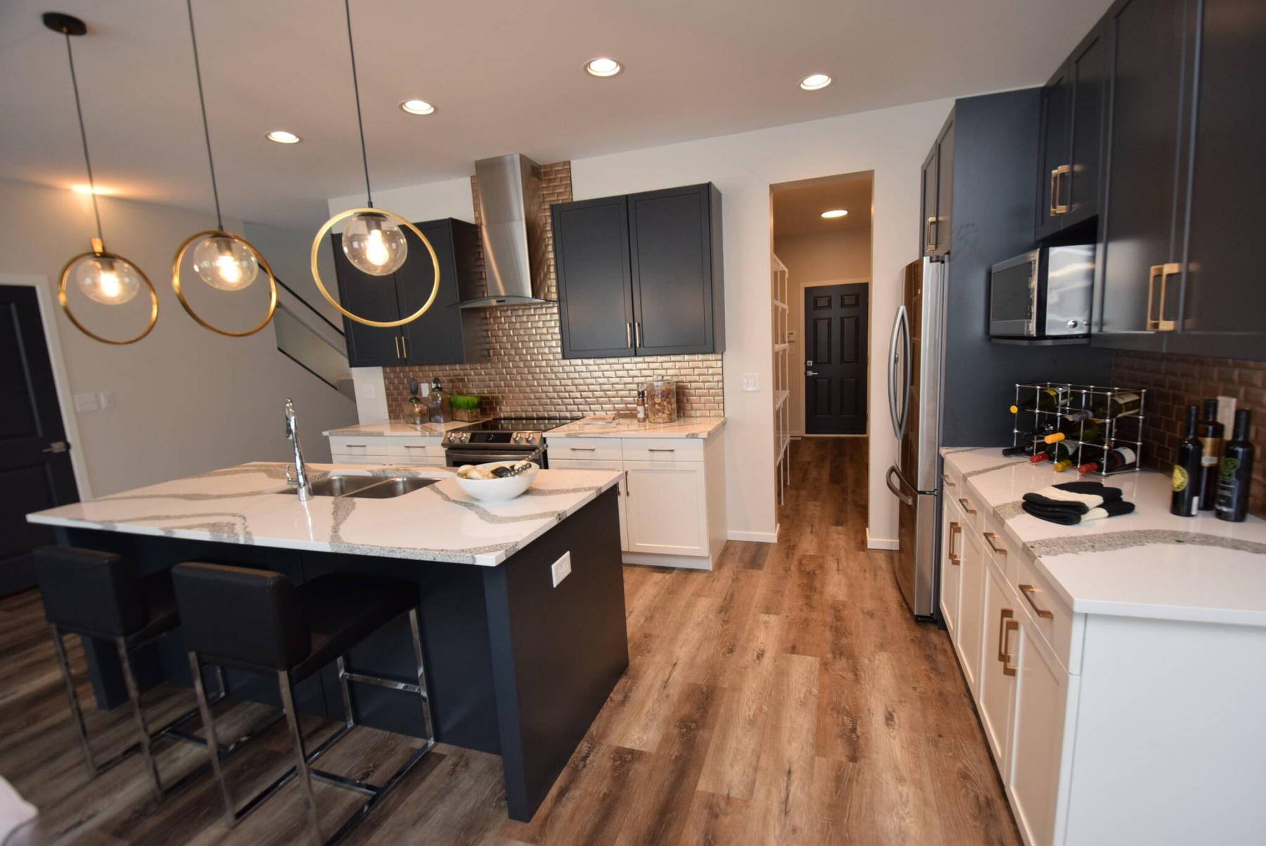 The island kitchen features quartz countertops, a gold ceramic tile backsplash, modern grey cabinetry and a walk-through pantry.