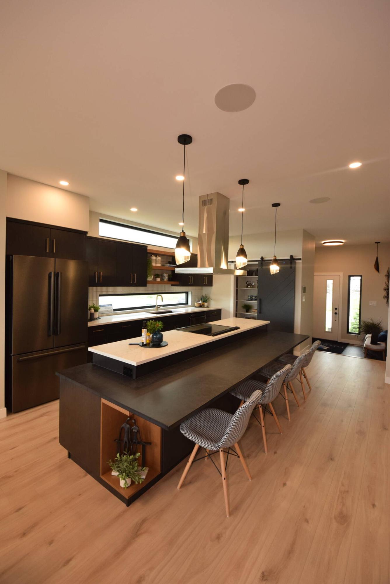 “It hits you with wow factor right away,” notes Mangat. “One of the design features that really draws their attention are black trimmed letterbox windows that were placed over the sink, and over the cabinets. They not only look incredible, but they also let in lots of extra light.”