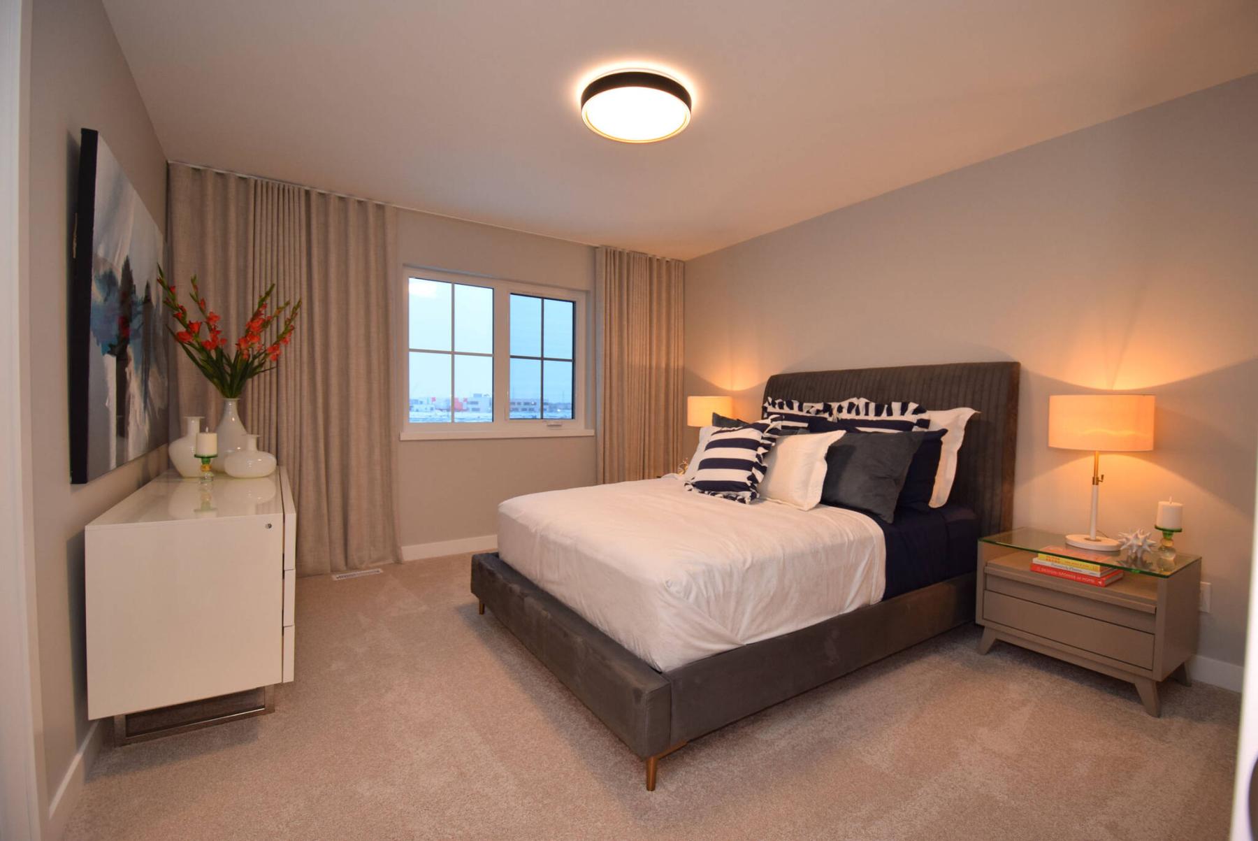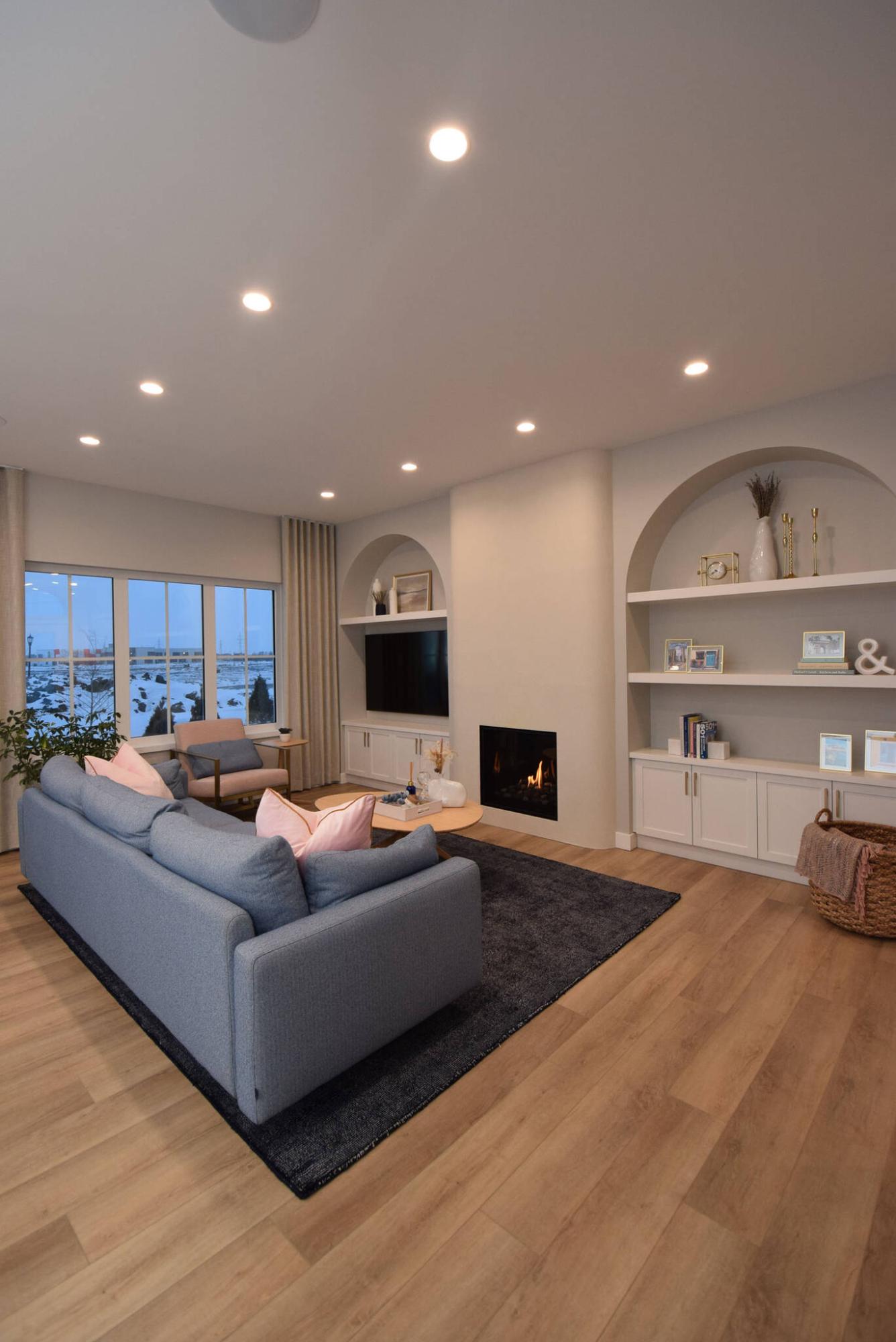 “All the classic colours work together beautifully, while the open-concept layout enhances functionality” Namaka says. “The dining area — which is next to an oversized sliding patio door leading out to a big backyard deck — is huge, while the great room looks incredible with its entertainment unit with rounded shelving and gas fireplace set in a textured, taupe-plaster feature wall.”
