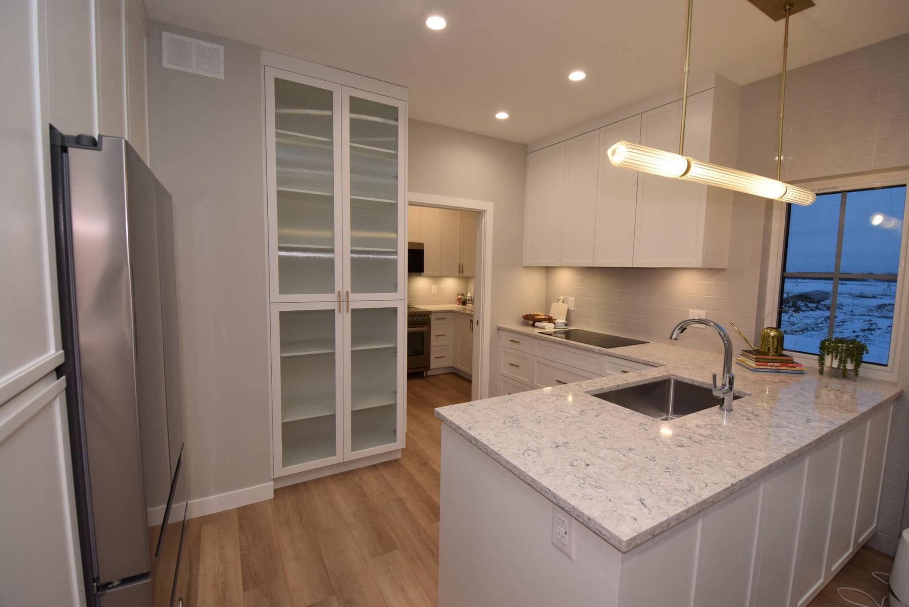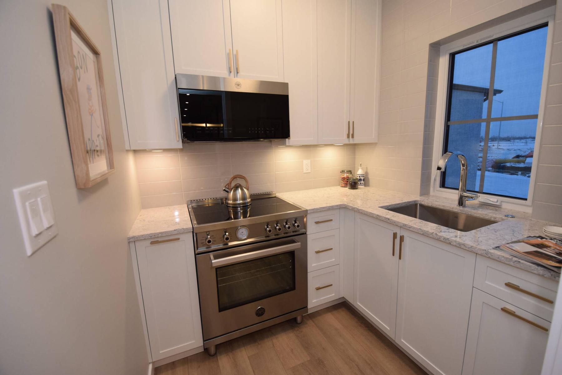 At the same time, the kitchen impresses with its simple finishes: white cabinets, gorgeous taupe/grey quartz countertops and taupe tile backsplash.
