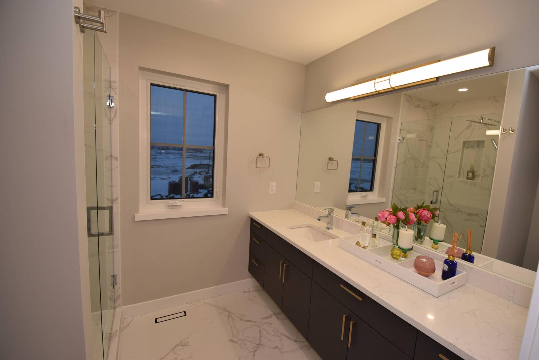 “The ensuite is a true retreat with its heated tile floor, and walk-in shower with the same marble-style surround as the floor. Overall, the home proves a classic design filled with simple, elegant finishes can generate all the wow factor you need with its natural beauty.”
