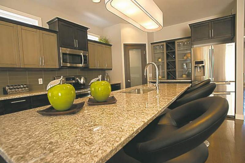 Each space in the great room is striking in its own way. The kitchen is notable for its contrasting finishes -- a good combination of portobello and cappuccino Shaker-style maple cabinets that pop on a taupe glass-tile backsplash. The long island is just the right length and width, as aisle width is ample, allowing ease of movement.