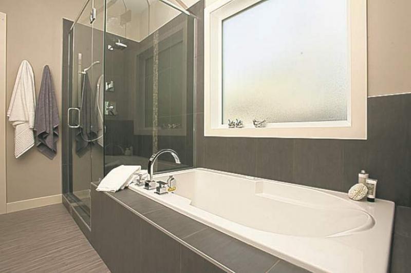 "We wanted it to have a bit of a spa look, so there's plenty of space, plus an air-jet tub (set in grey tile beneath a big obscured-glass window) and shower with tempered-glass front and grey tile surround with river-rock accents that were carried down to the floor," she said. "There's a floating portobello vanity, and the floor is a high-end grey vinyl with a bamboo look that matches all the colours perfectly. It's a very private, relaxing space."