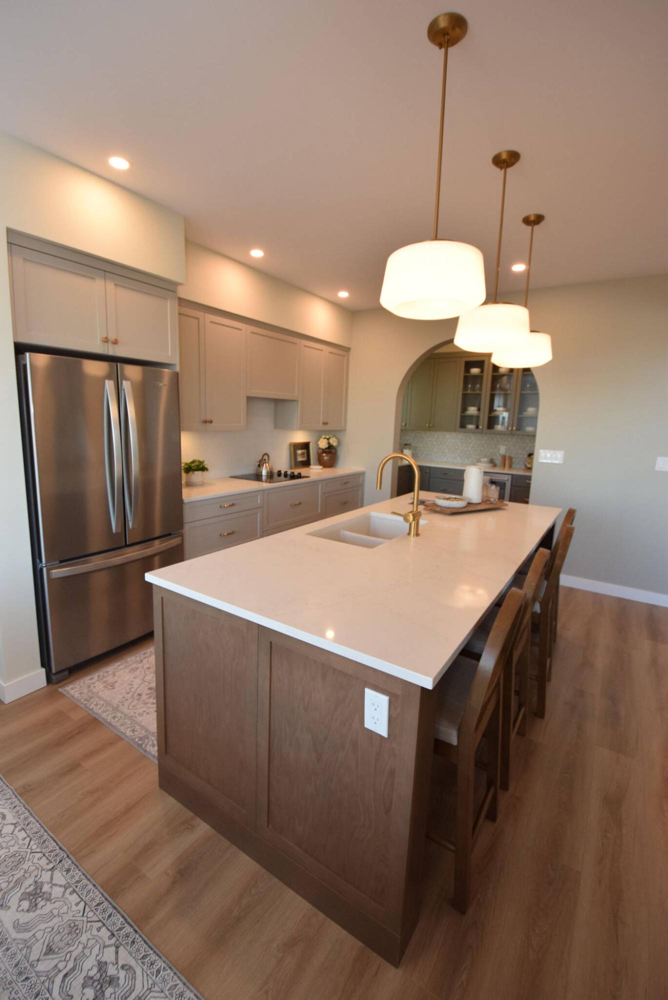 A butler’s pantry with wide, arched doorway serves as a backdrop for the island kitchen in Kensington Homes’ two-storey Heartstone model show home in Sage Creek.