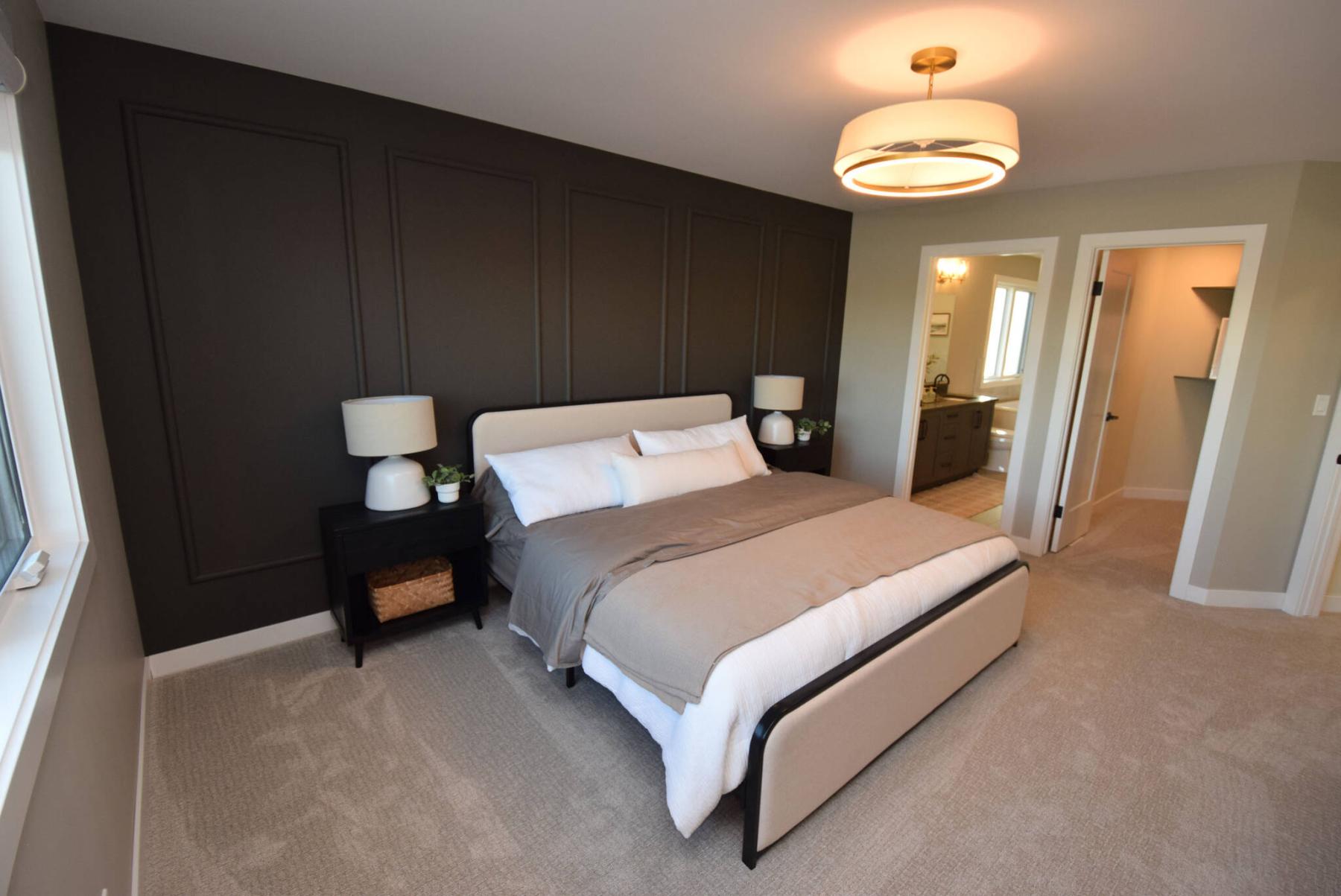 “That feel comes from a dark-brown panelled feature wall behind the bed and the natural light that streams in from a large window on its rear wall. There’s also a big walk-in closet and spa-like ensuite.”
