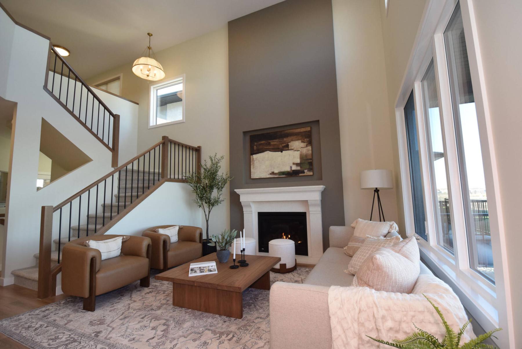 “You have the awesome staircase,” says Ranson. “It opens the space up and provides a great view of the great room from above. There’s also the soaring ceilings and floor-to-ceiling windows, which come together to make a bright, airy space. A gas fireplace with a micro-cement veneer is a perfect finishing touch, giving the space a cosy, welcoming feel.”