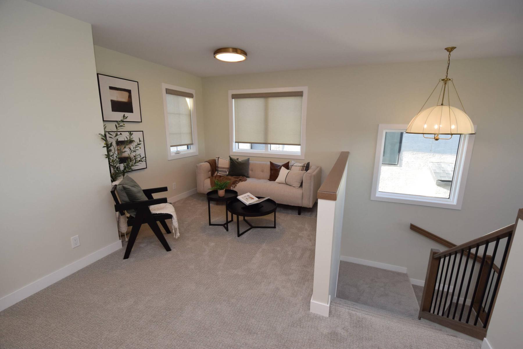 “It’s a good-sized space with a stub wall that defines it and closes it off from the staircase,” says Ranson. “It has two windows, and can be used as an office, media area or hangout spot for the kids.”