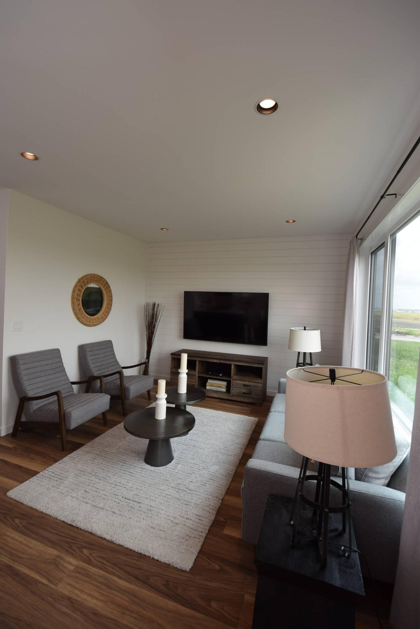 The naturally bright great room comes with a sharp-looking shiplap feature wall.