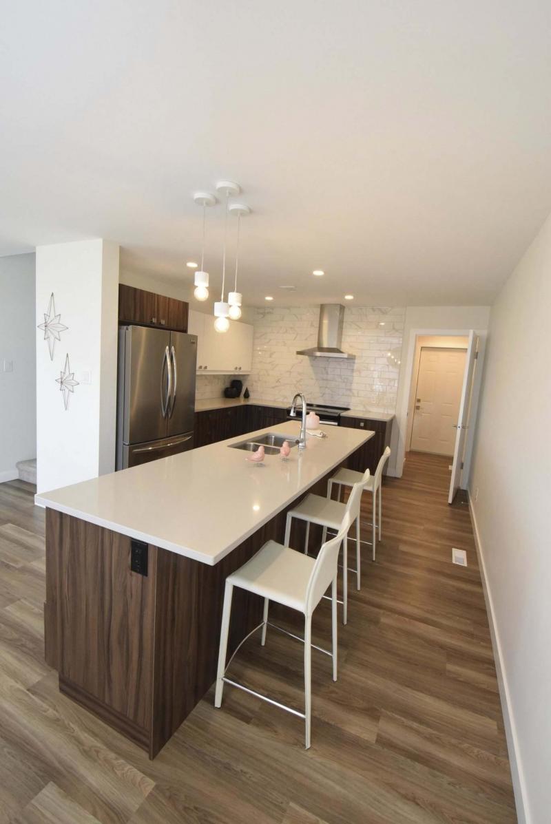 The kitchen features oak laminate plank flooring and taupe quartz countertops.