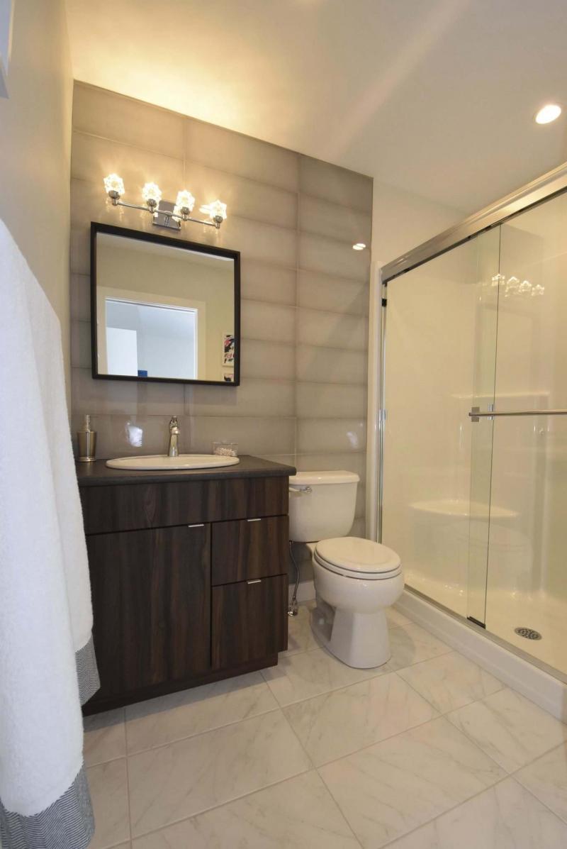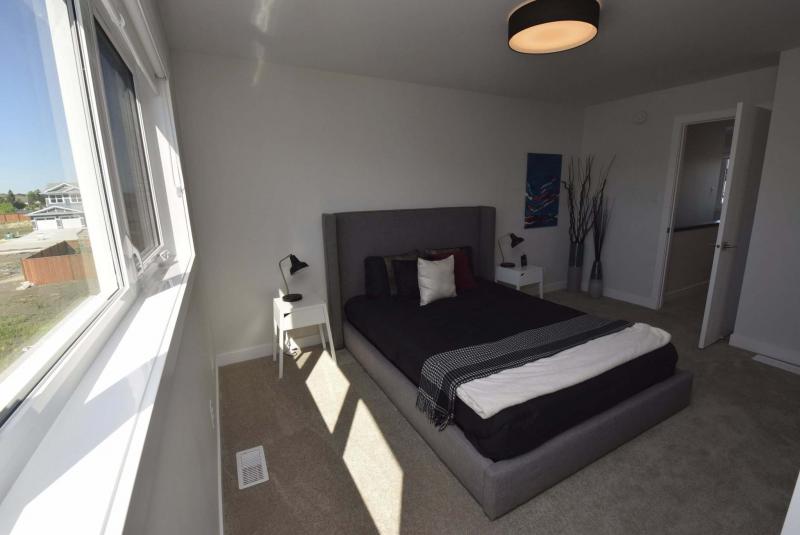 A huge three-piece picture window set up high on the rear wall lets in loads of light, yet preserves privacy. A three-piece ensuite with four-foot shower, off-white/taupe tile floor and walnut vanity with taupe tile backdrop provides a spot to freshen up in style, while a big, semi-open walk-in closet provides plenty of storage space for wardrobes and accessories.