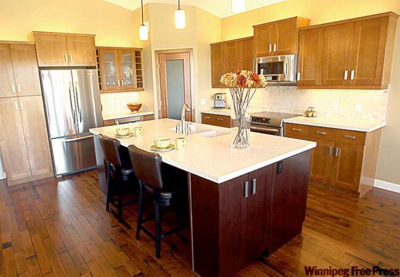 Meanwhile, there's lots of other features to take in: the rear wall of windows that showcases the wetlands view out back, a chef's kitchen with nine-foot CaesarStone island, maple cabinets, mahogany pantry and impressively wide aisles -- and huge dinette area by double deck doors with transoms to increase the view out back (and let in more natural light).