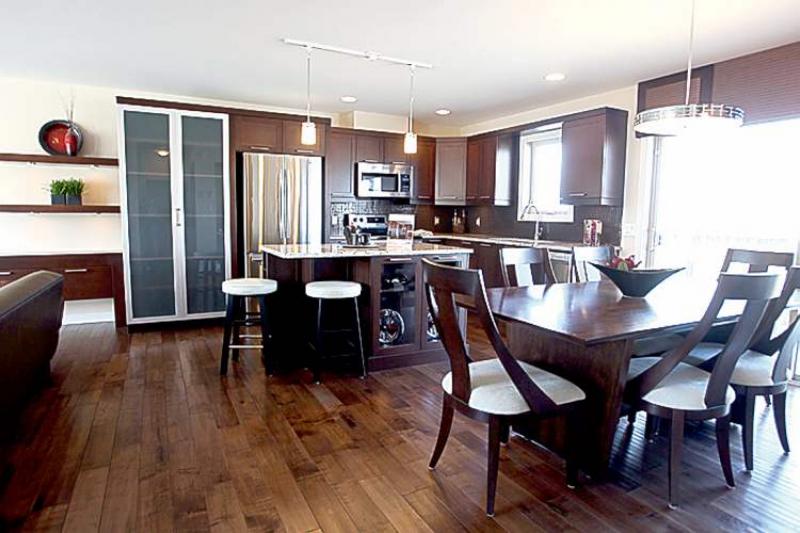 There's ample room for a table for six (which would be situated adjacent to balcony doors), plus another two seats at the island's eating nook for two. Meanwhile, the living room is close enough to the dining area to be proximate, yet set far enough away to be a separate space. At the same time, there's plenty of space to sit and chat après diner with coffee and dessert.